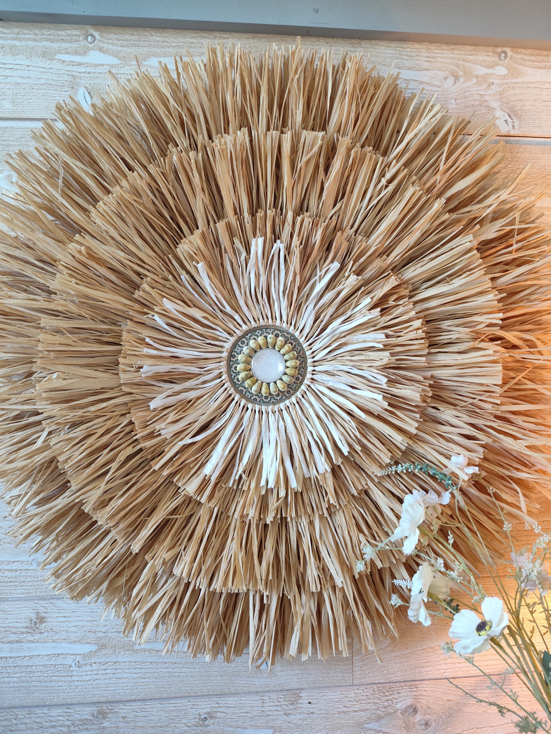 Décoration murale en raphia naturel, jujuhat ou juju-hat, son centre est composé de raphia beige et blanc, de cordes de lin, d’un imprimé durci et d’un colier de coquillage caurus, le tout sur une ossature bois (MDF) pourvu d’une attache murale.