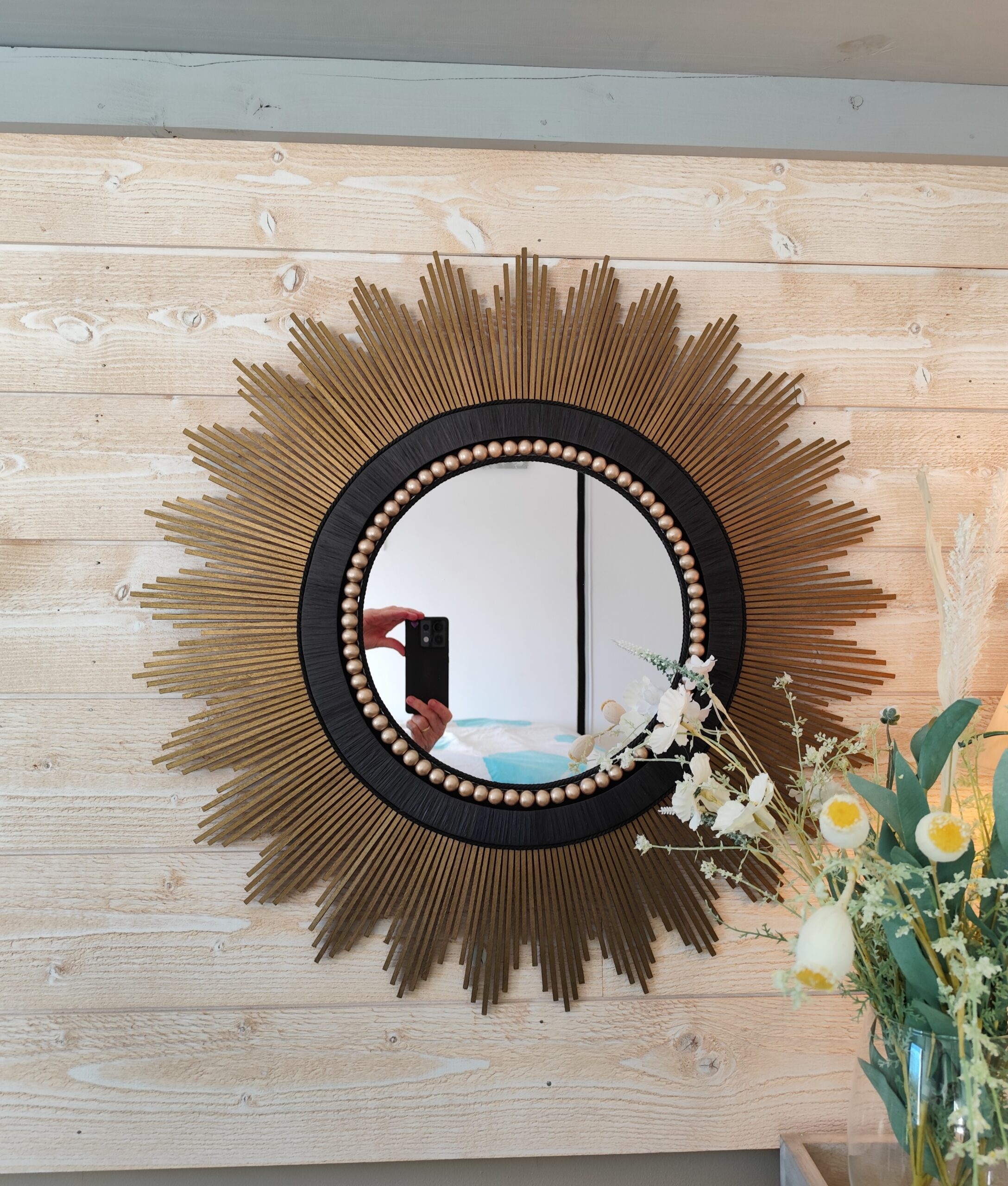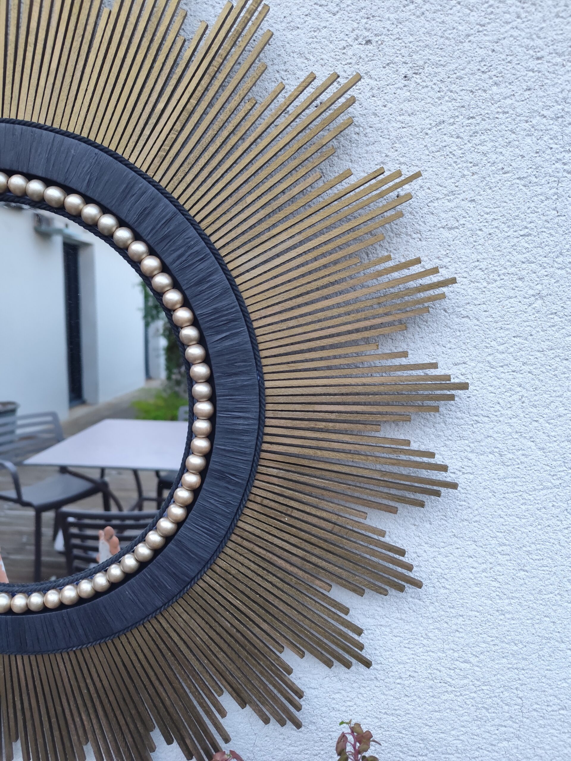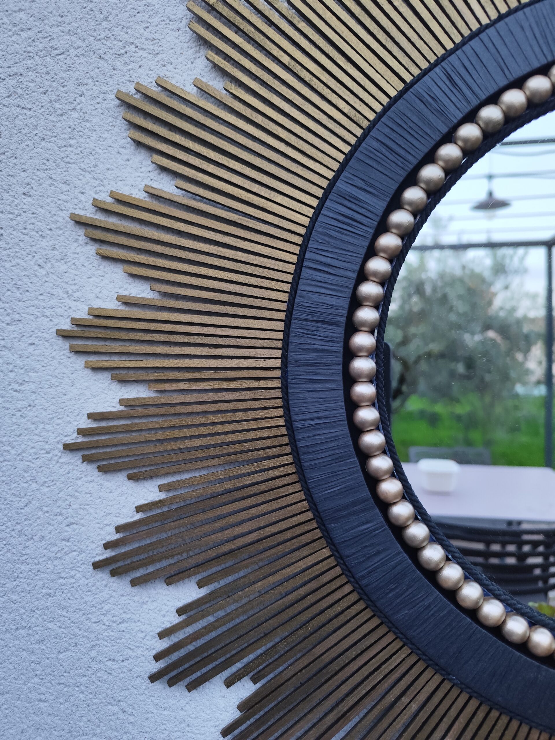 Grand miroir rond en bois teinté or antique, il est cerné d’un bois recouvert d’un raphia tressé noir, de cordes de lin ainsi que d’un collier de perles de bois dans les couleurs identiques.