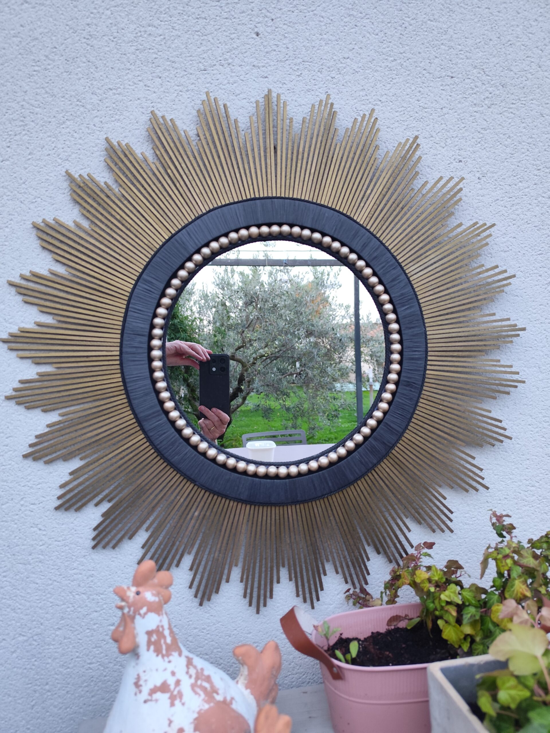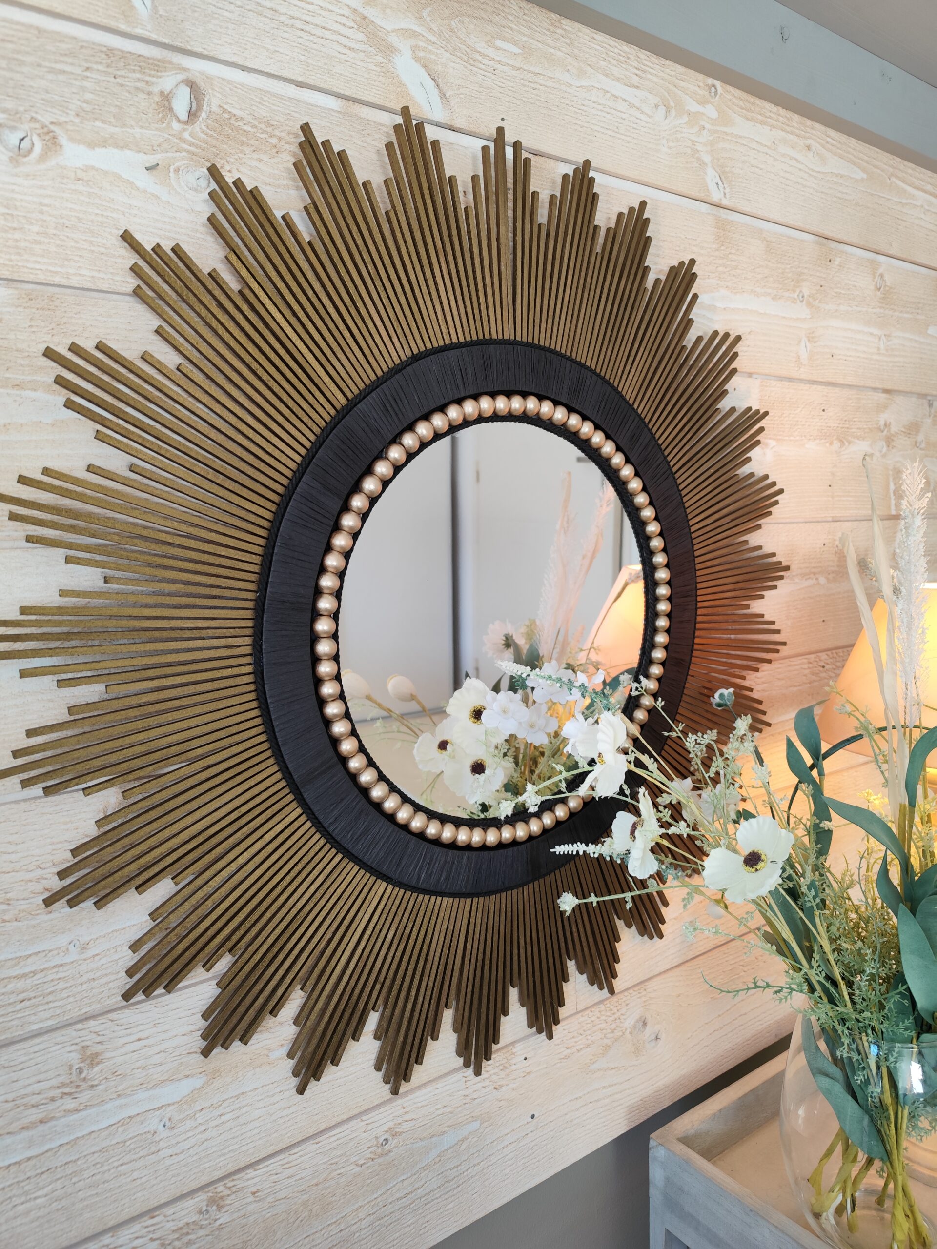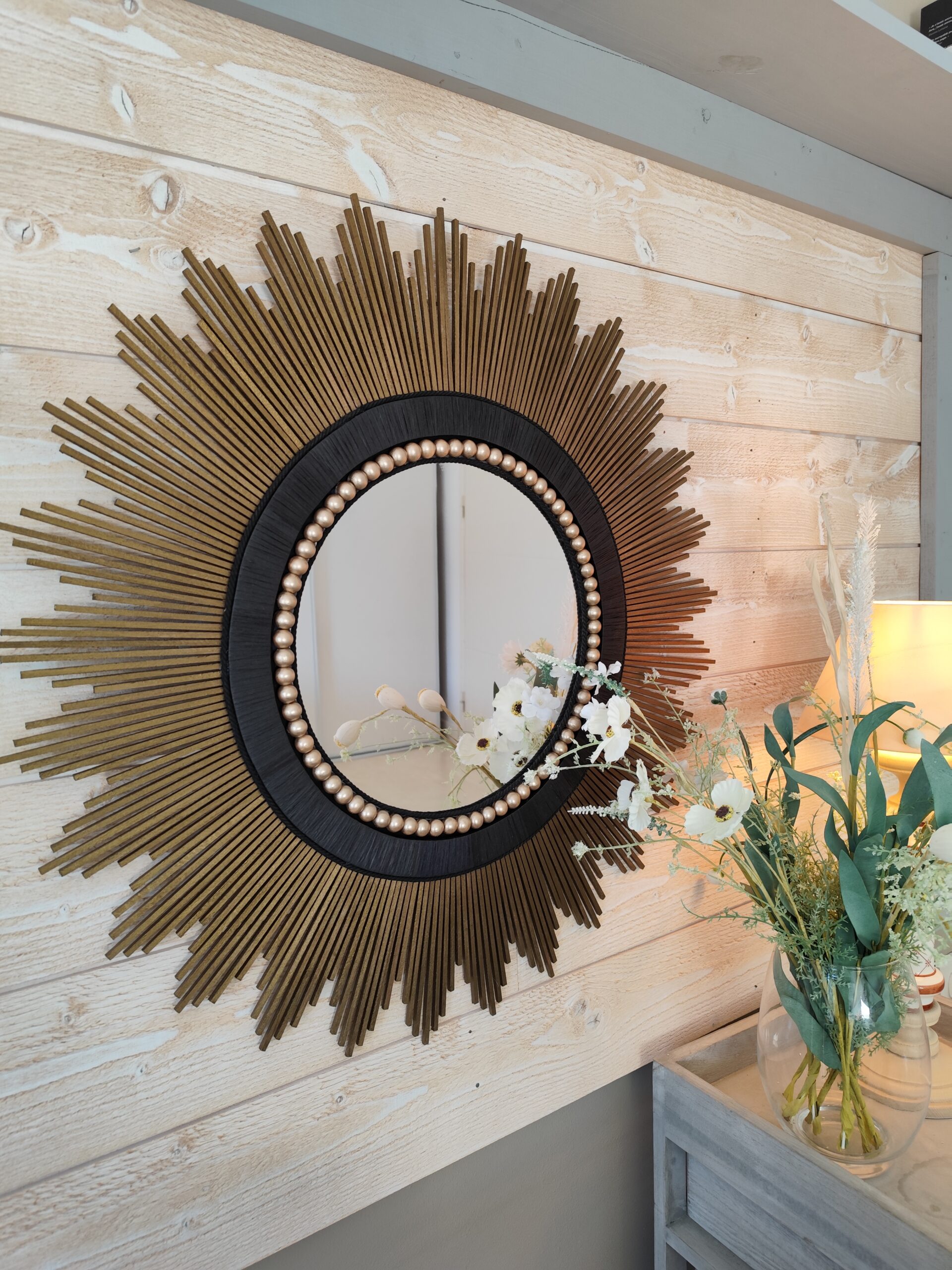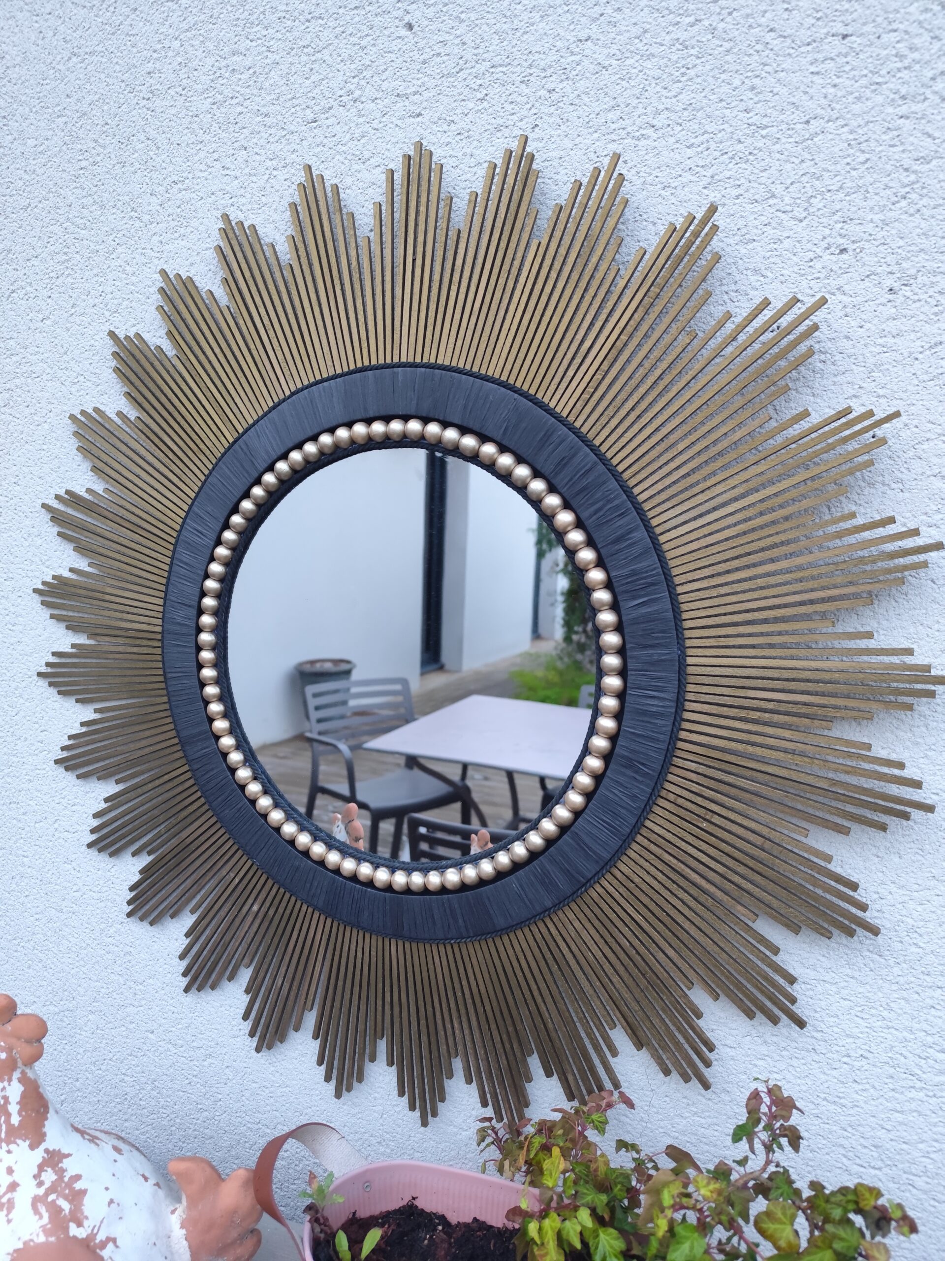 Grand miroir rond en bois teinté or antique, il est cerné d’un bois recouvert d’un raphia tressé noir, de cordes de lin ainsi que d’un collier de perles de bois dans les couleurs identiques.
