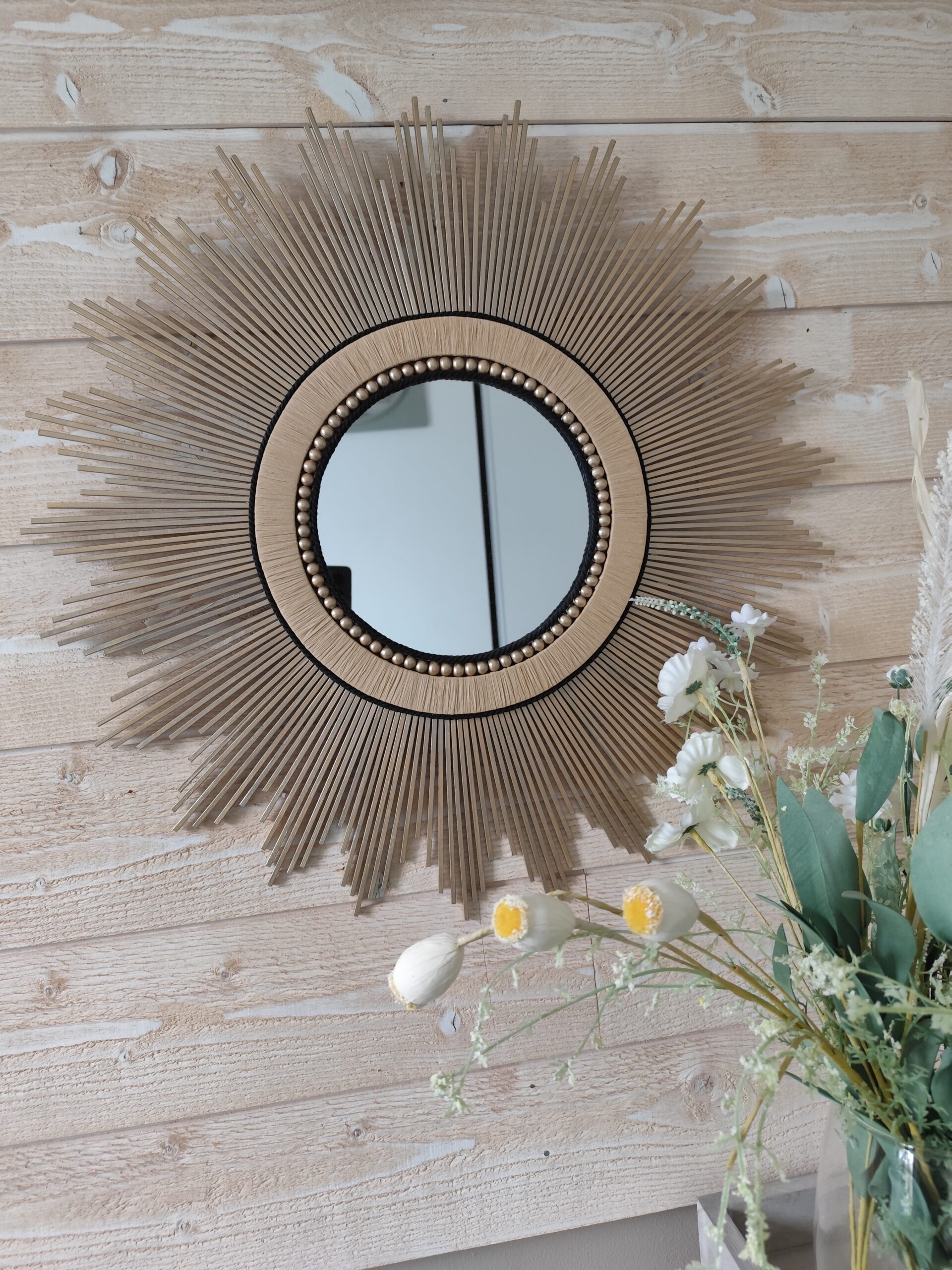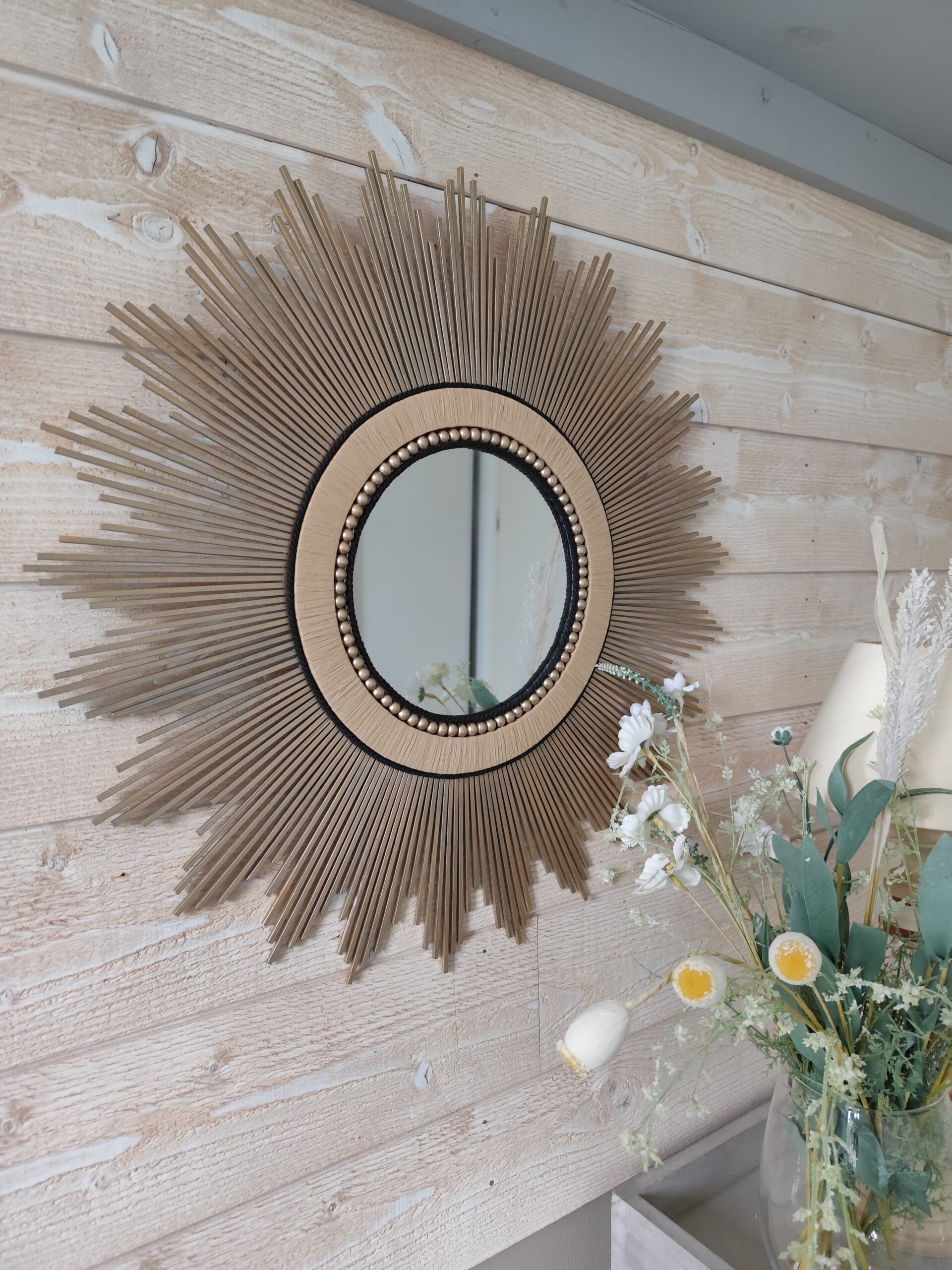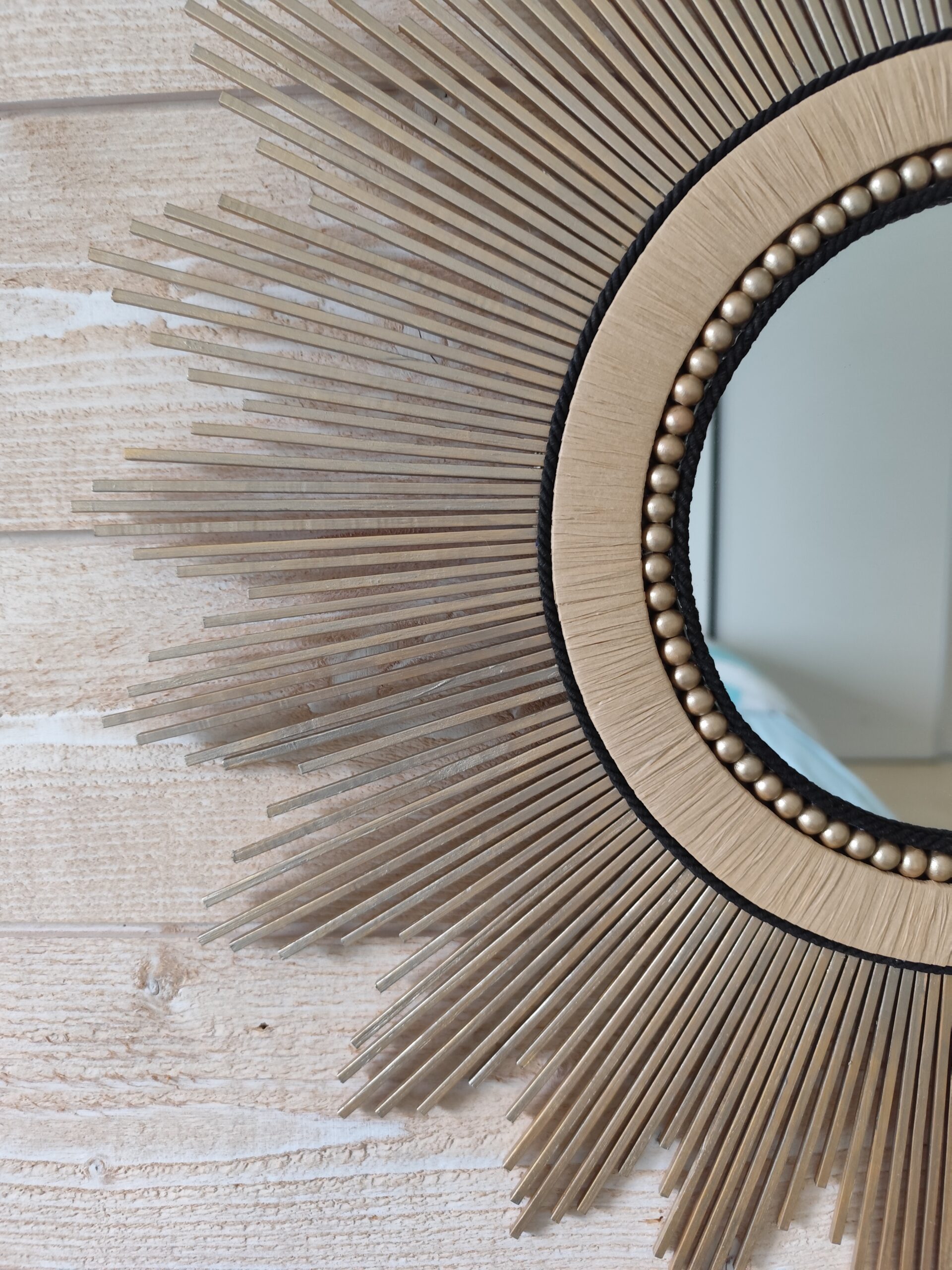 Miroir rond en bois teinté or champagne, il est cerné d’un bois recouvert d’un raphia tressé naturel, de cordes de lin noire ainsi que d’un collier de perles de bois or.