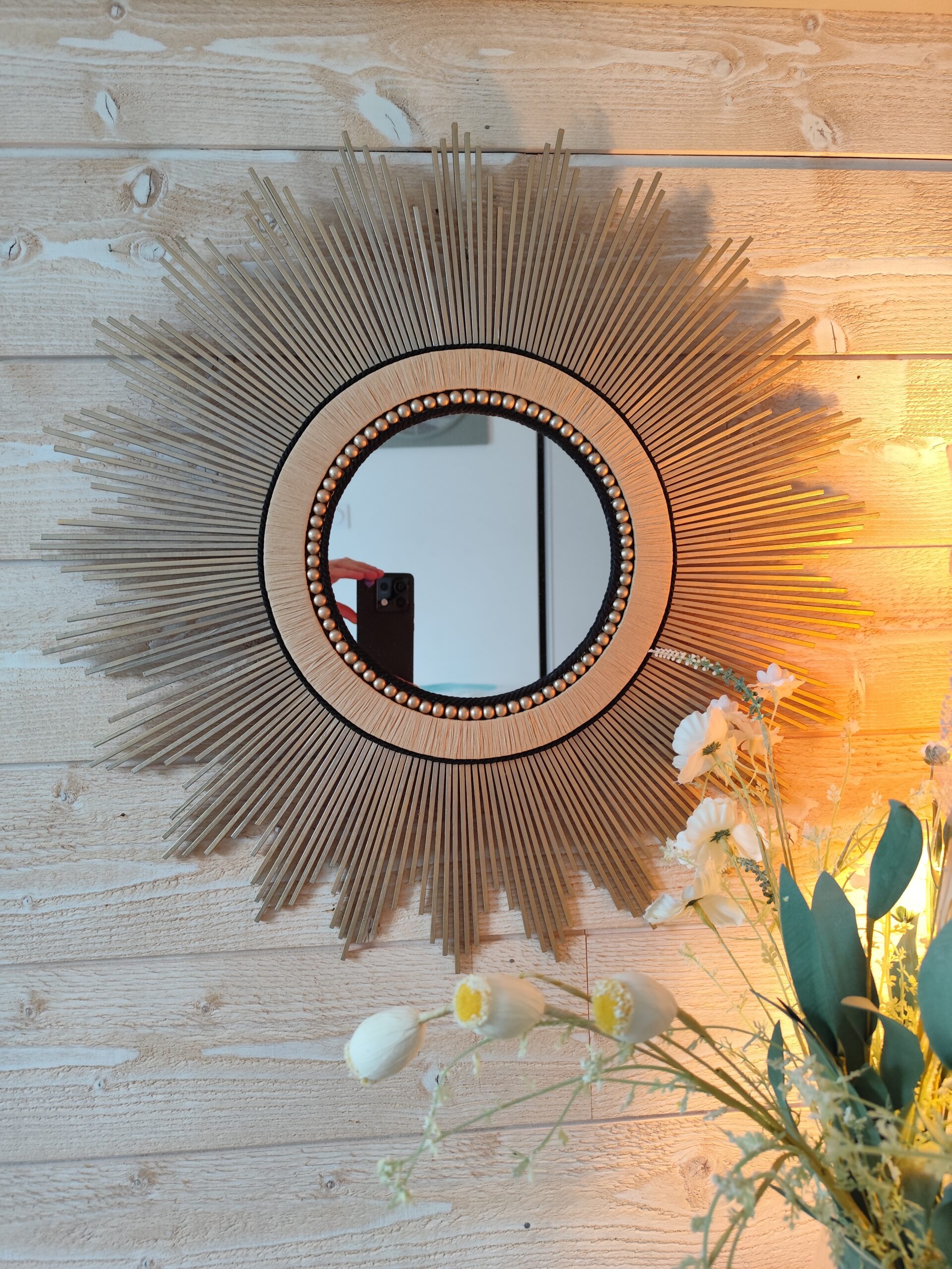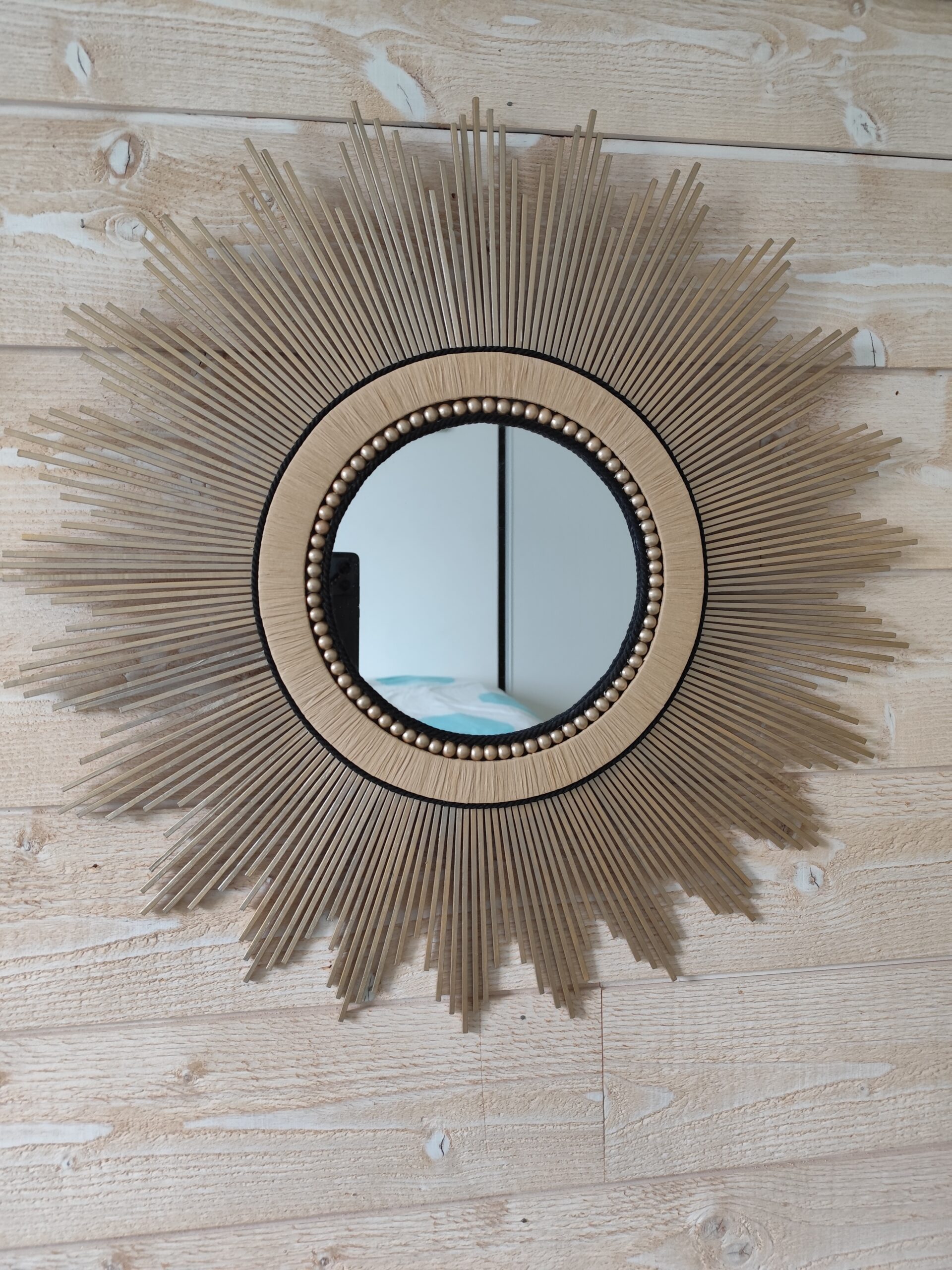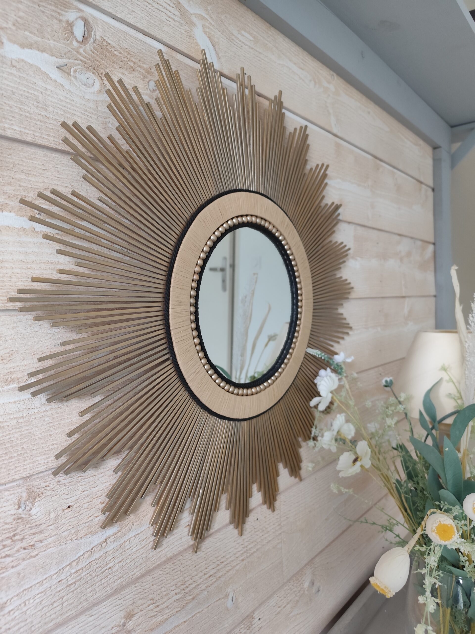 Miroir rond en bois teinté or champagne, il est cerné d’un bois recouvert d’un raphia tressé naturel, de cordes de lin noire ainsi que d’un collier de perles de bois or.