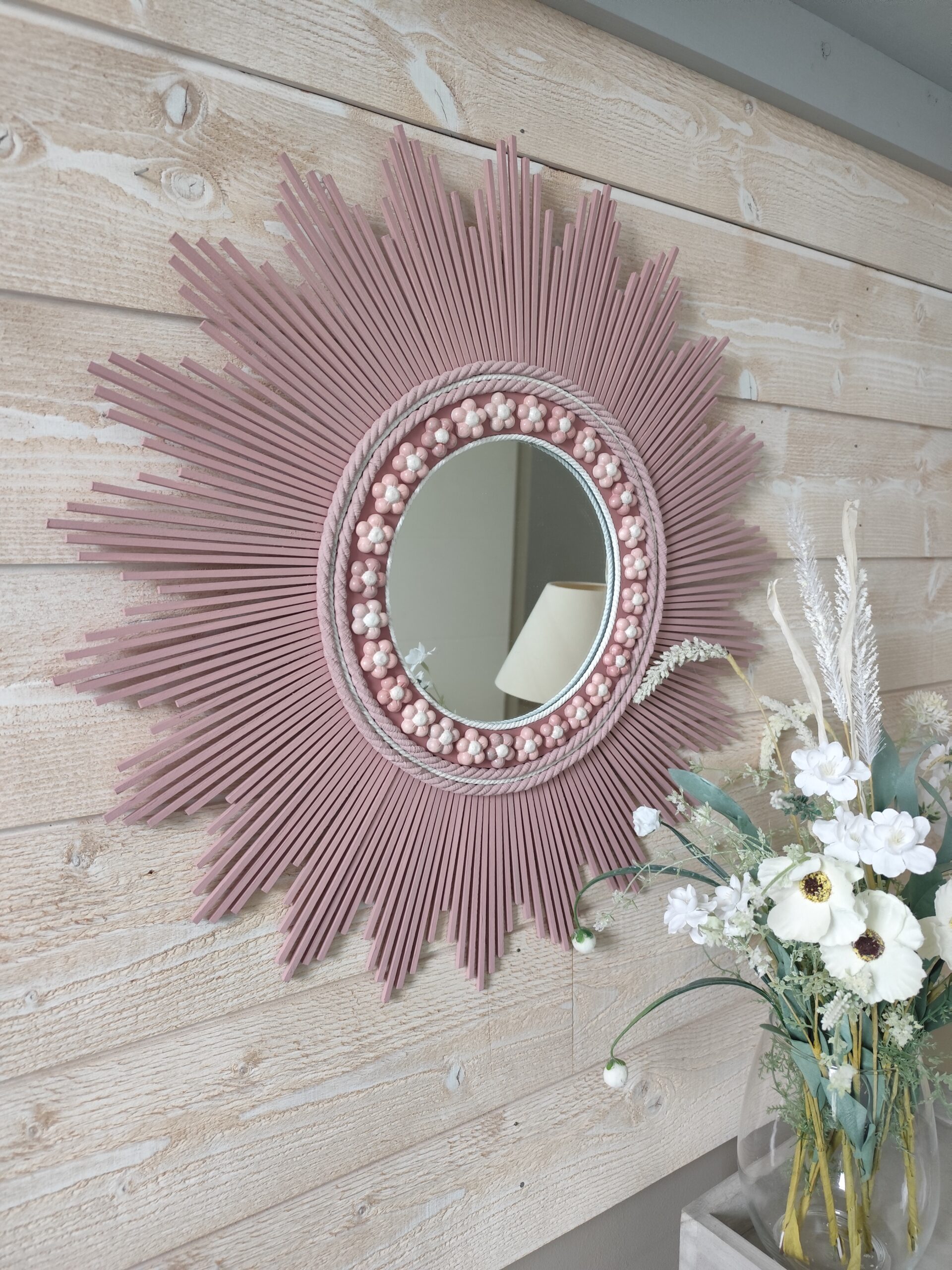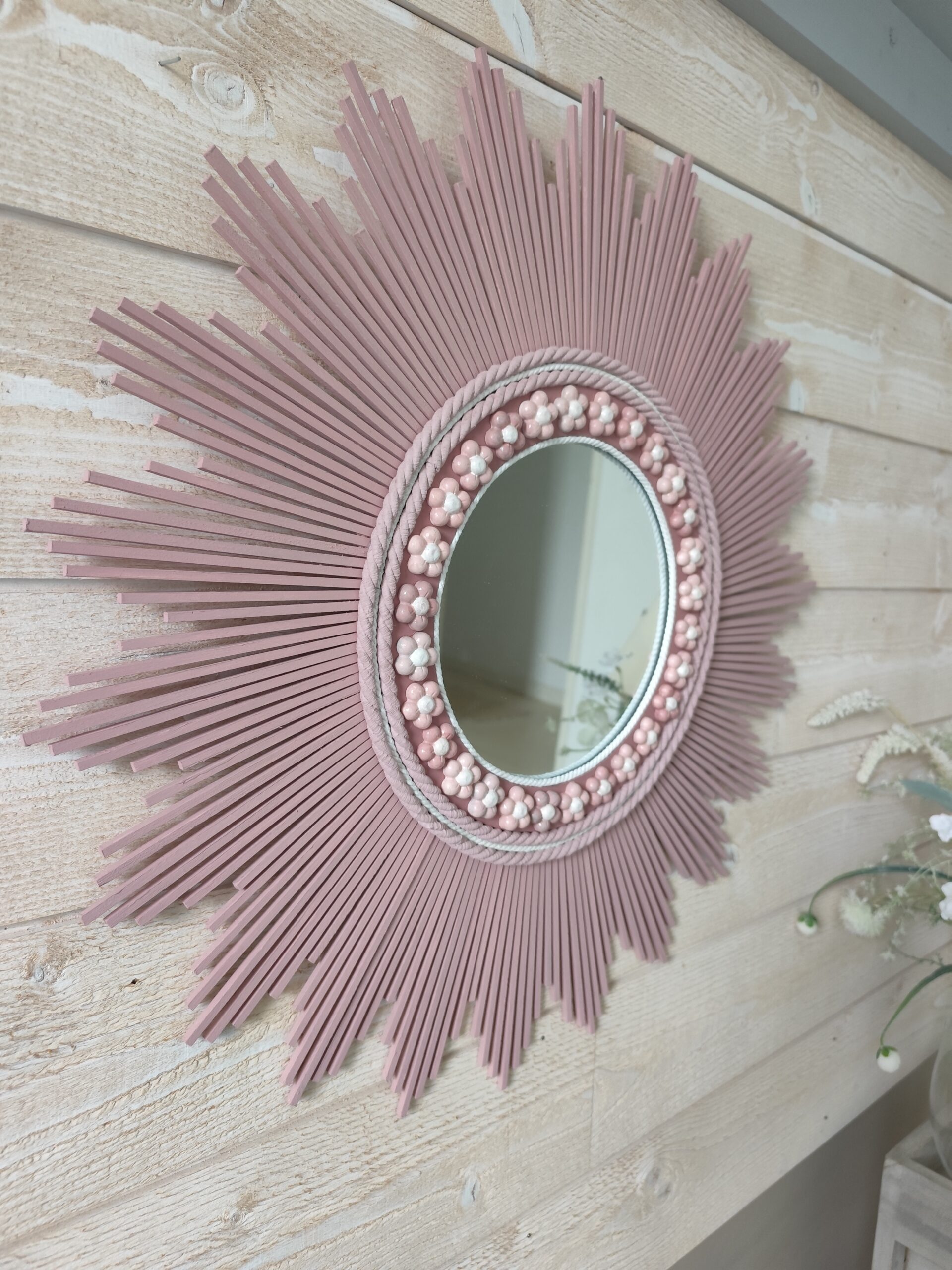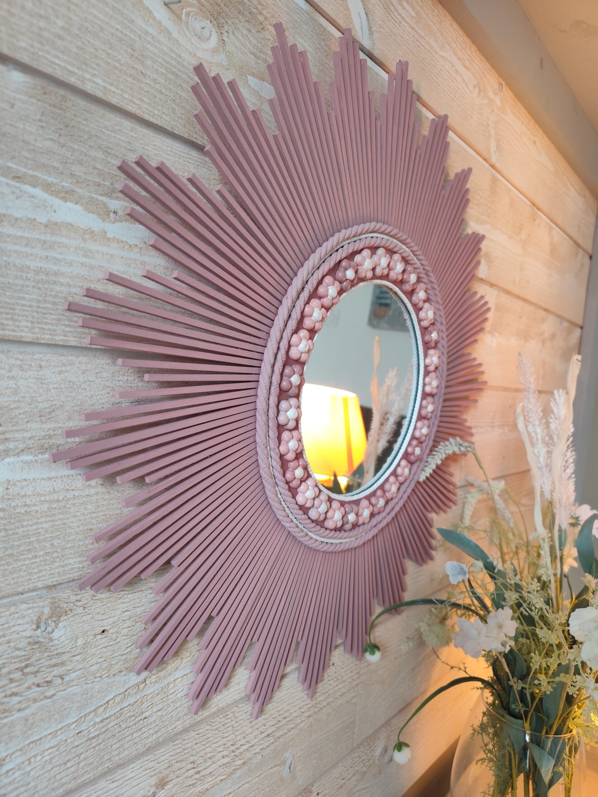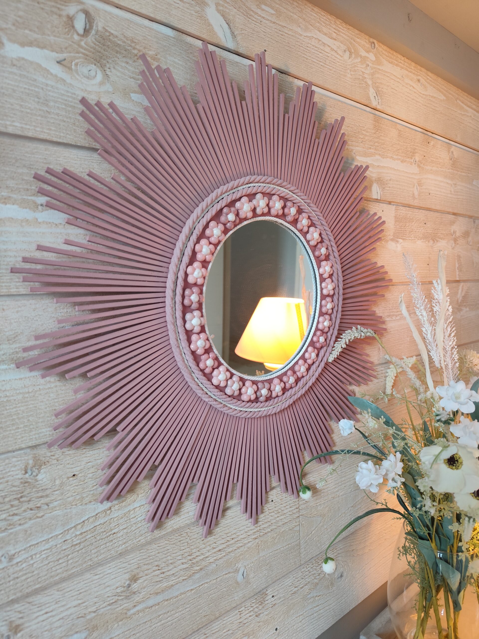 Décoration soleil.Miroir rond en bois teinté rose tendance, cerné d’éléments déco.Ju0273