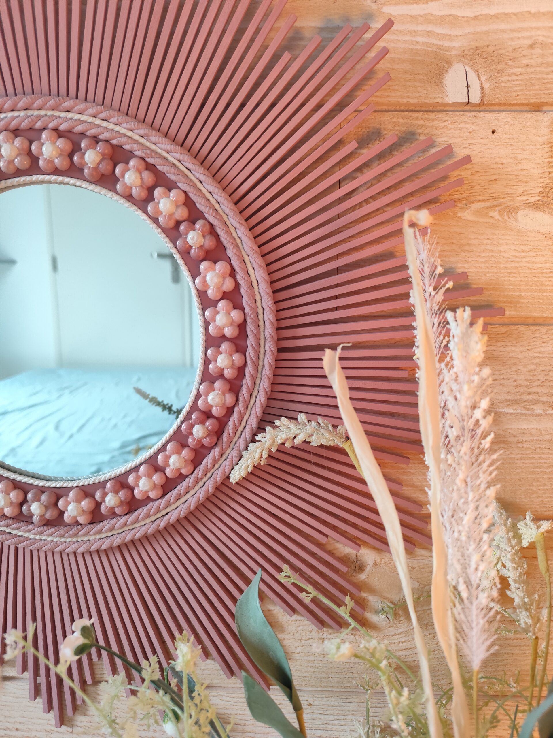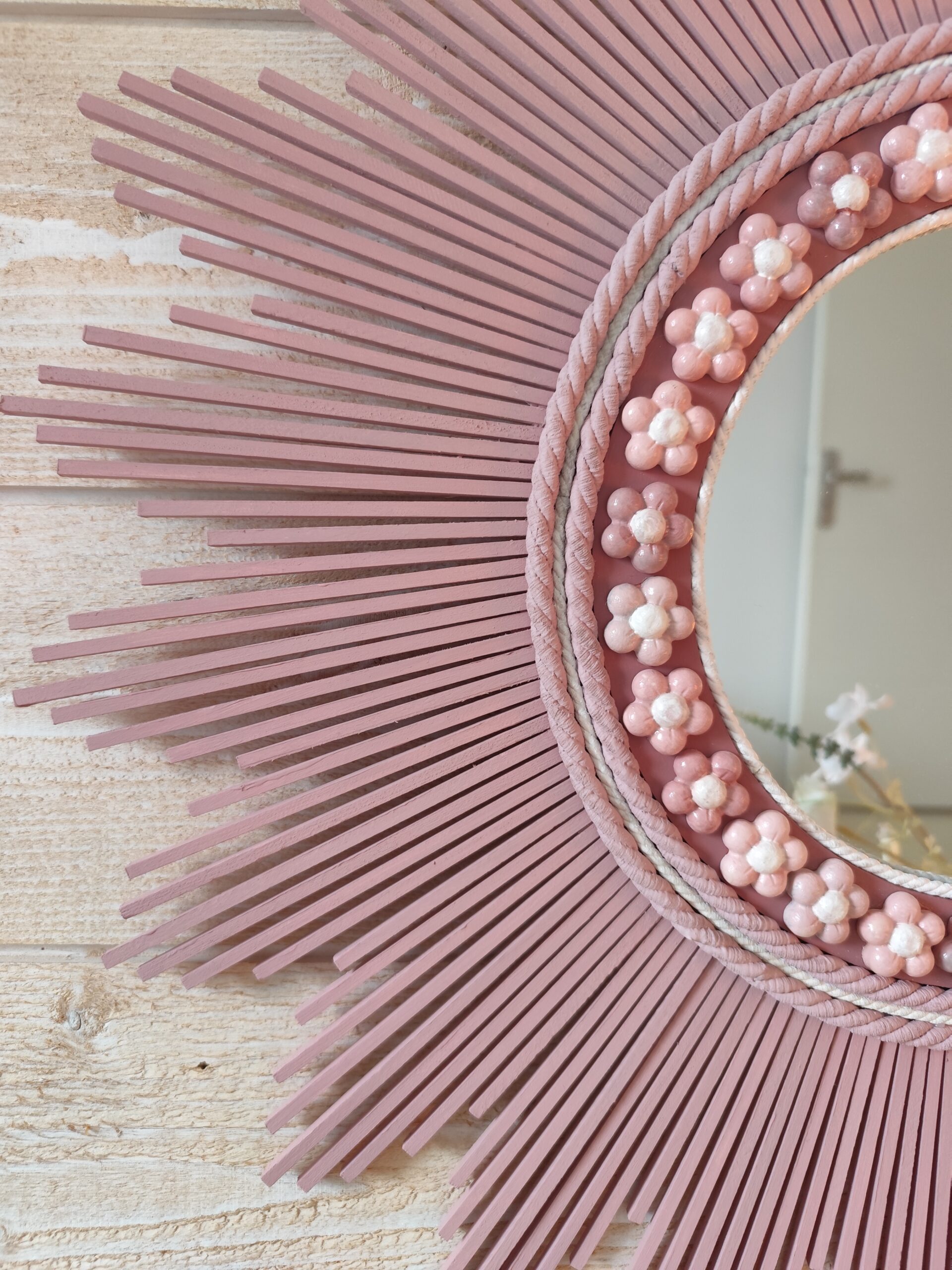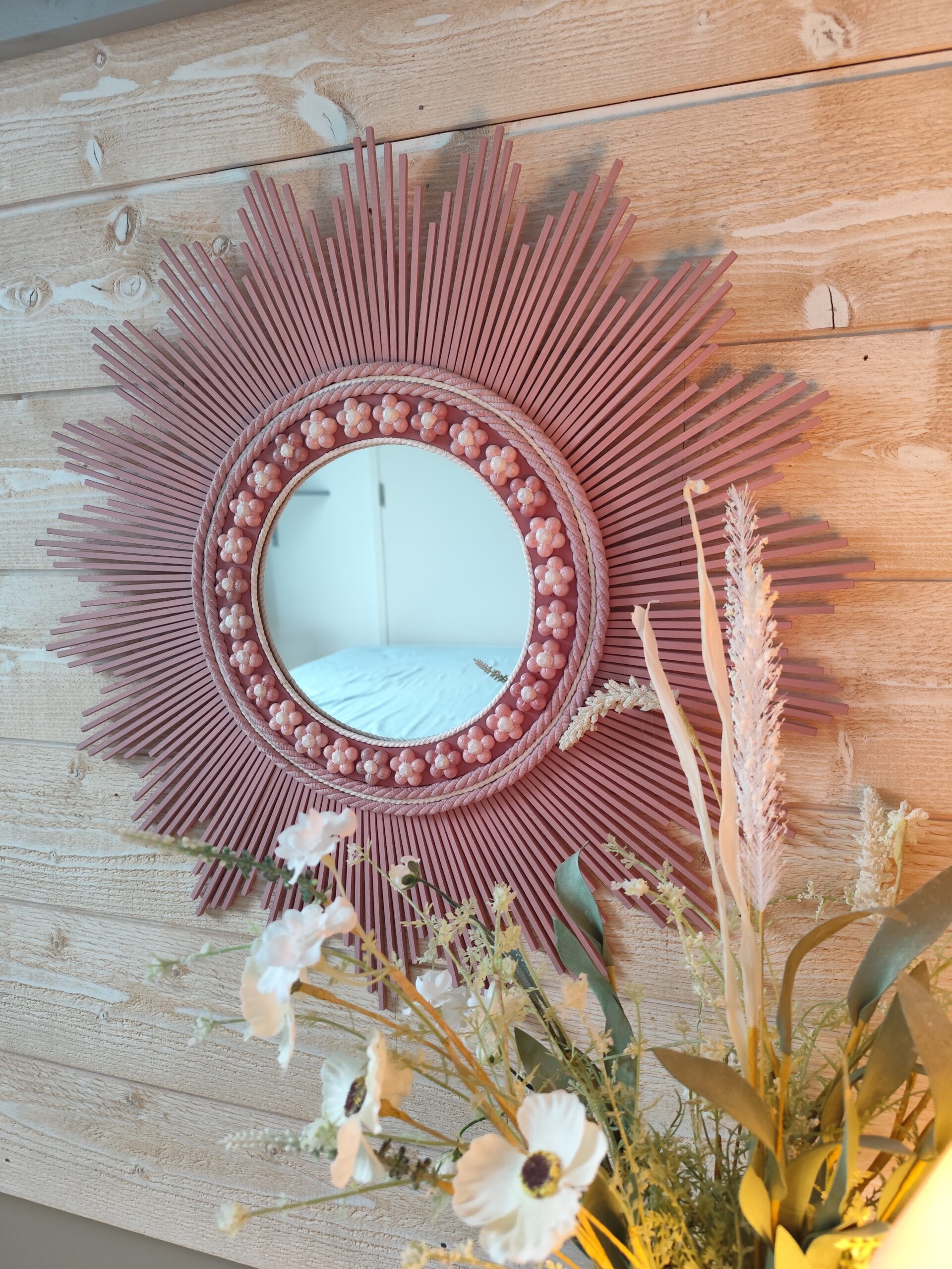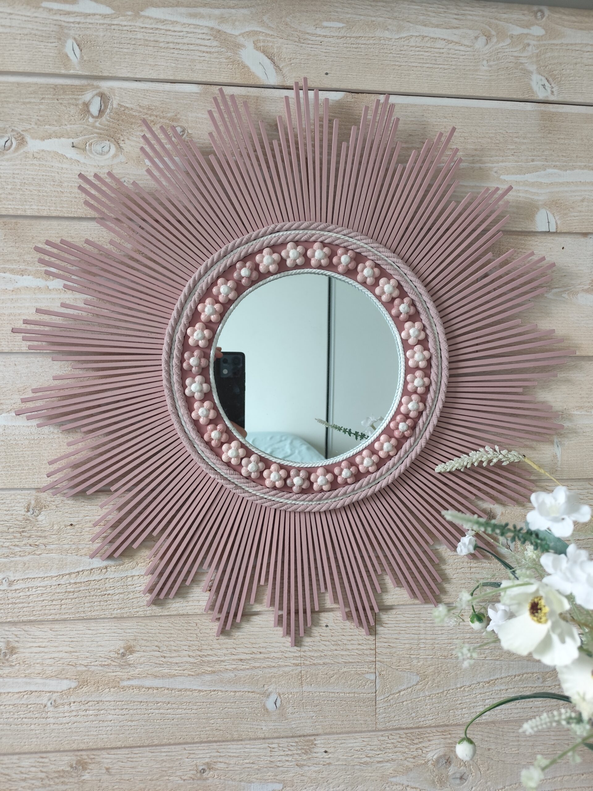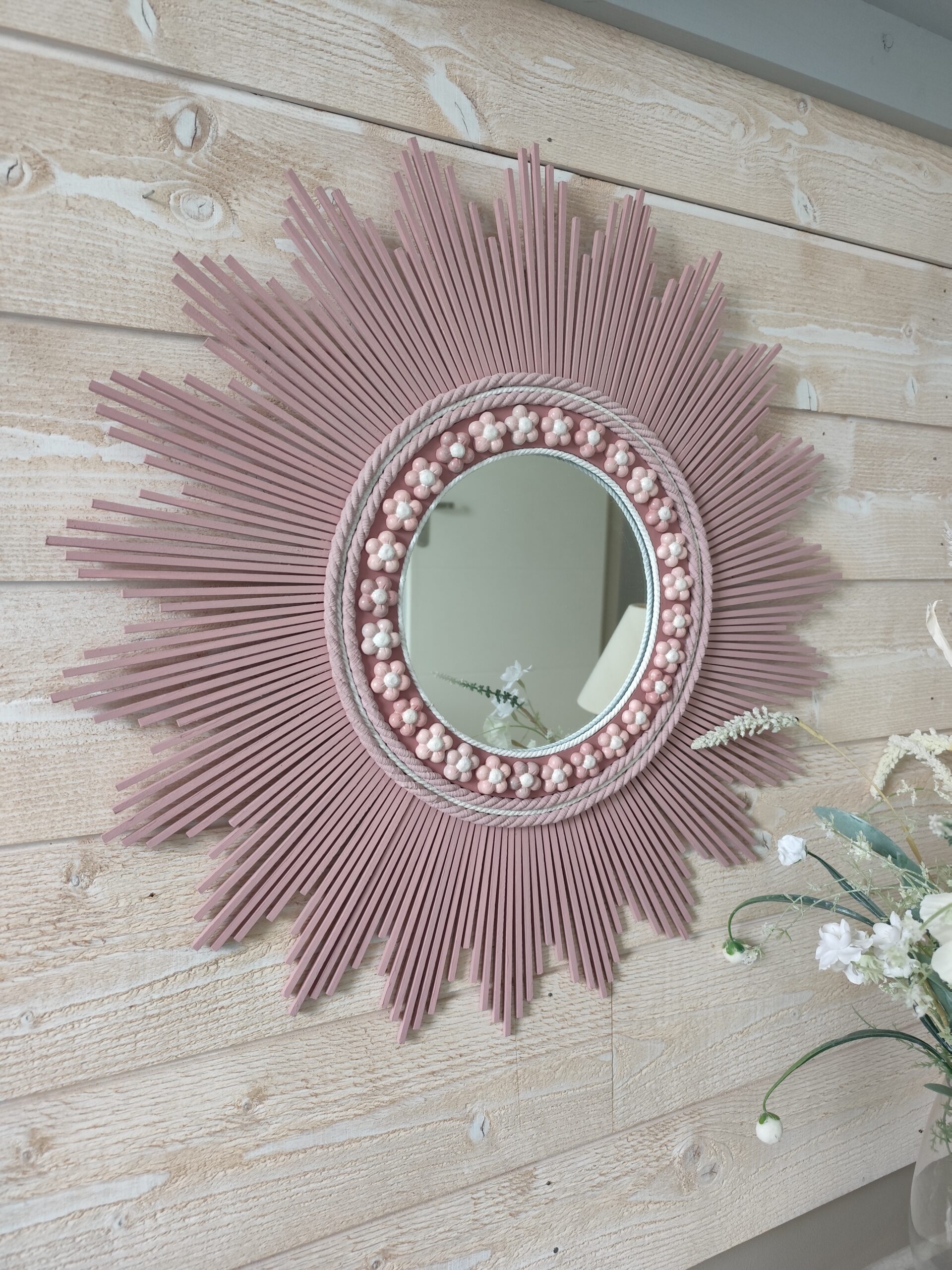 Décoration soleil.Miroir rond en bois teinté rose tendance, cerné d’éléments déco.Ju0273