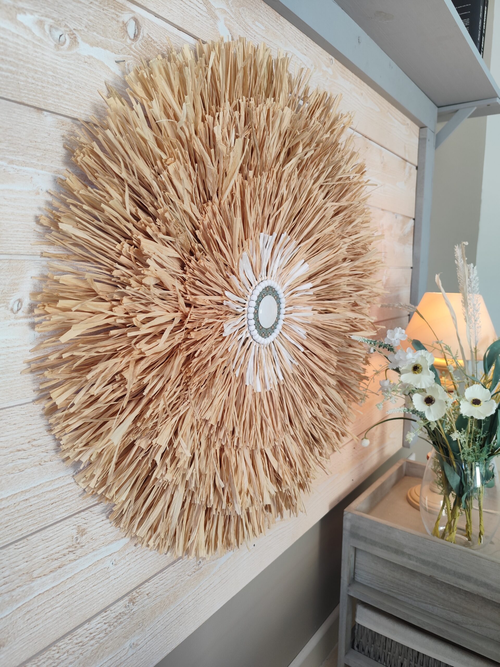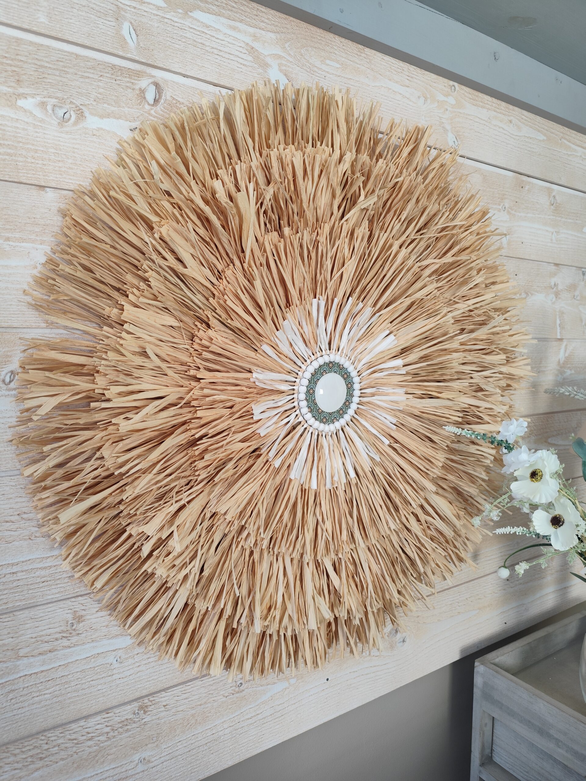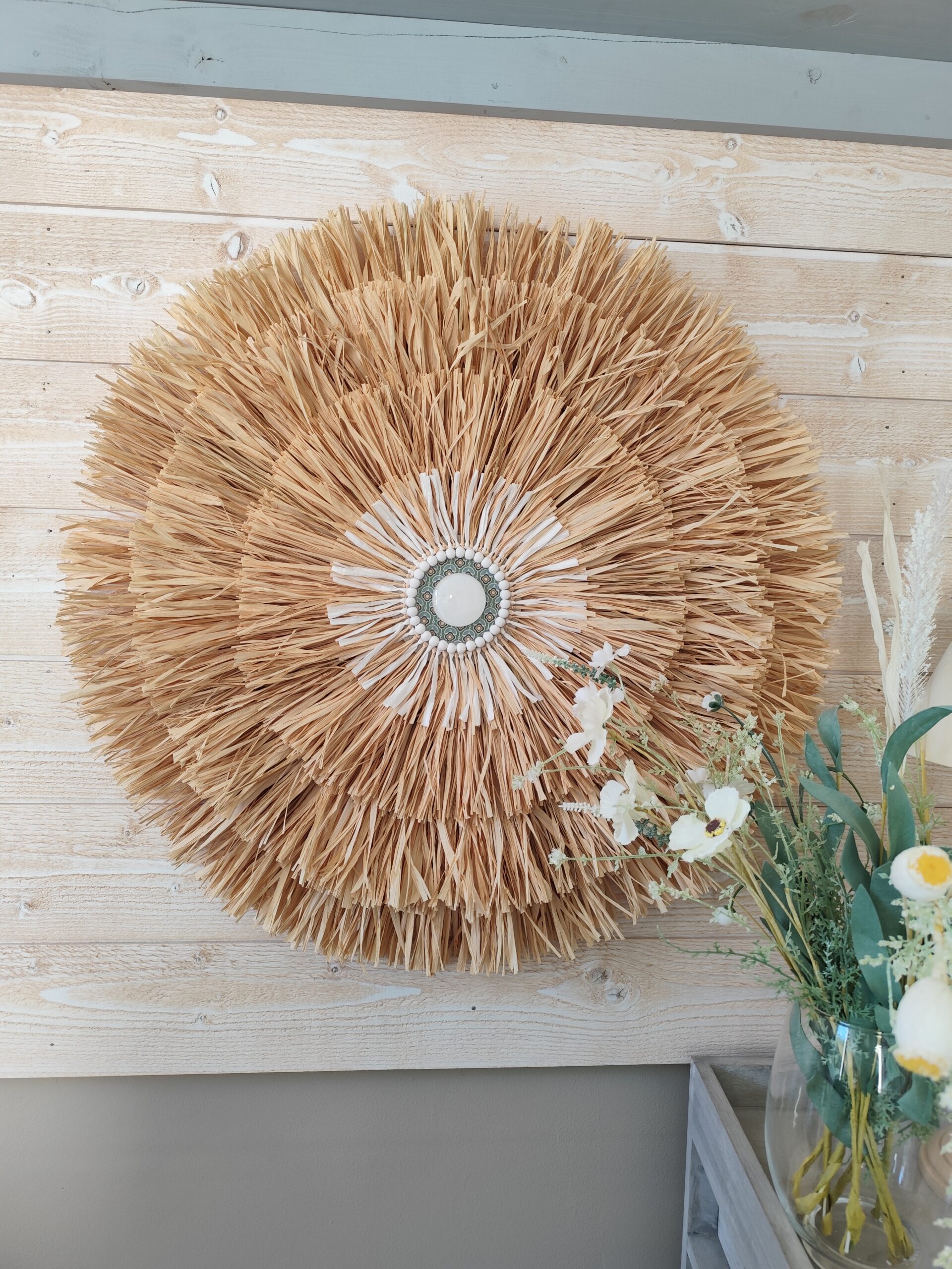 Cette réalisation faite-main combinera le raphia naturel sur 4 niveaux ainsi qu’un élément décoratif tout en relief.Le diamètre fait 70cms.Les articles sont des créations personnelles et donc uniques.Des variations de teintes et de dimensions peuvent survenir.Si vous désirez quelques options personnelles, contactez moi, tout est possible, tout est réalisable.