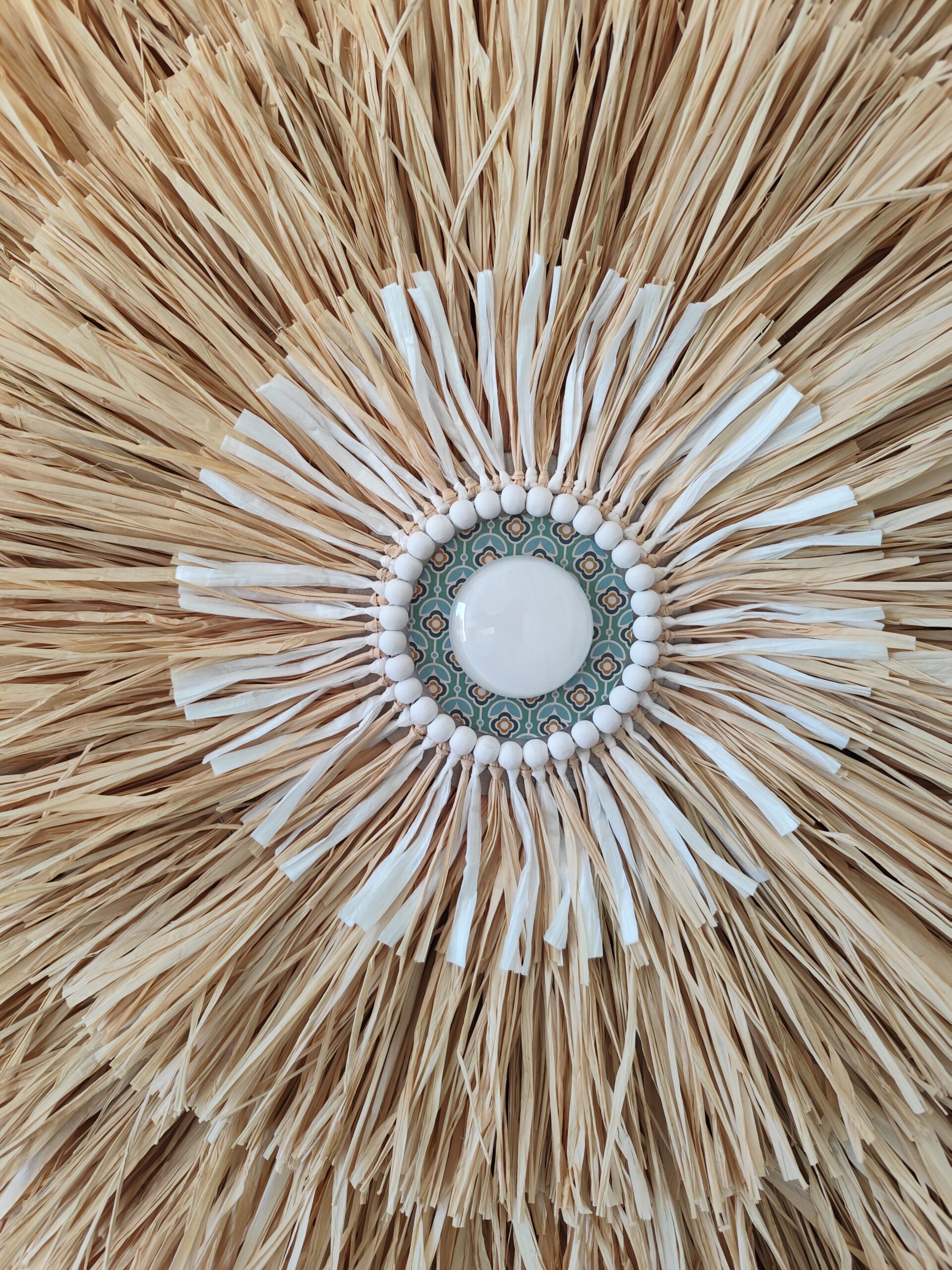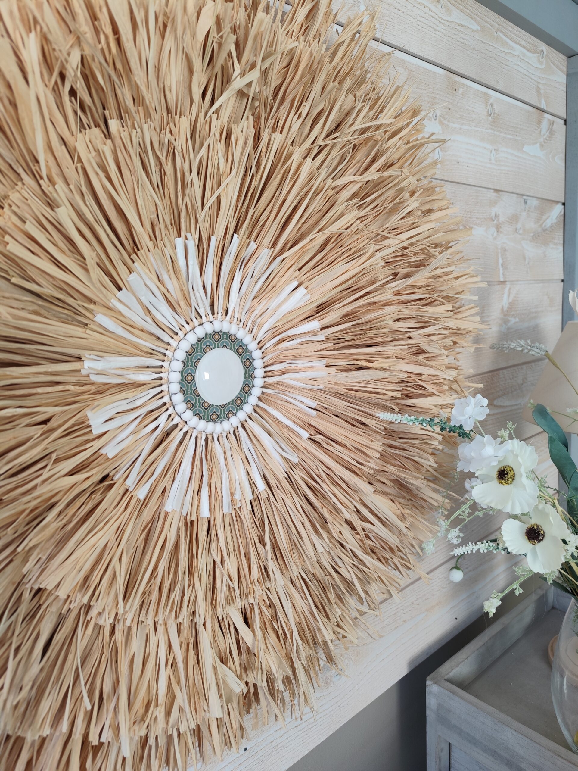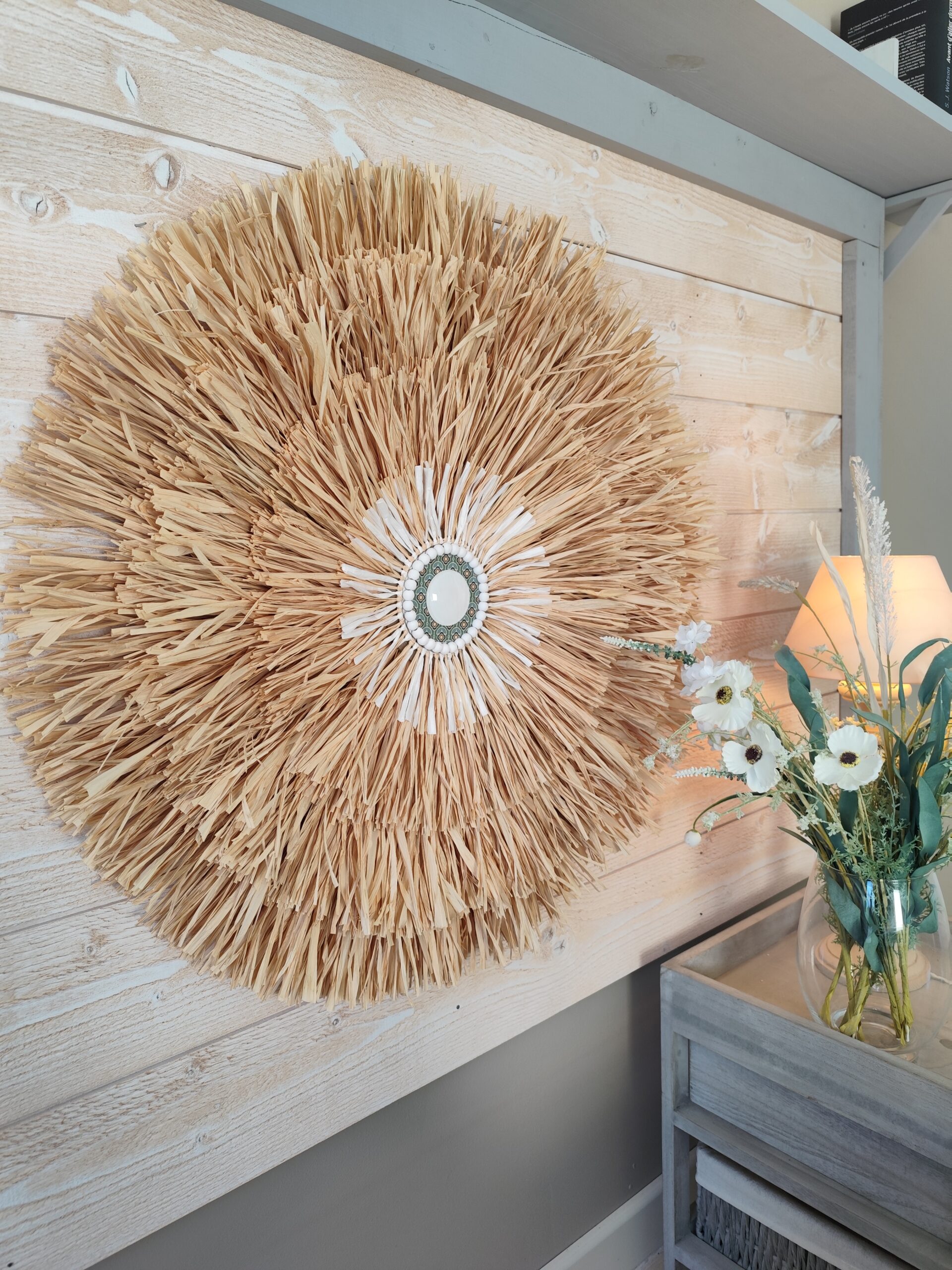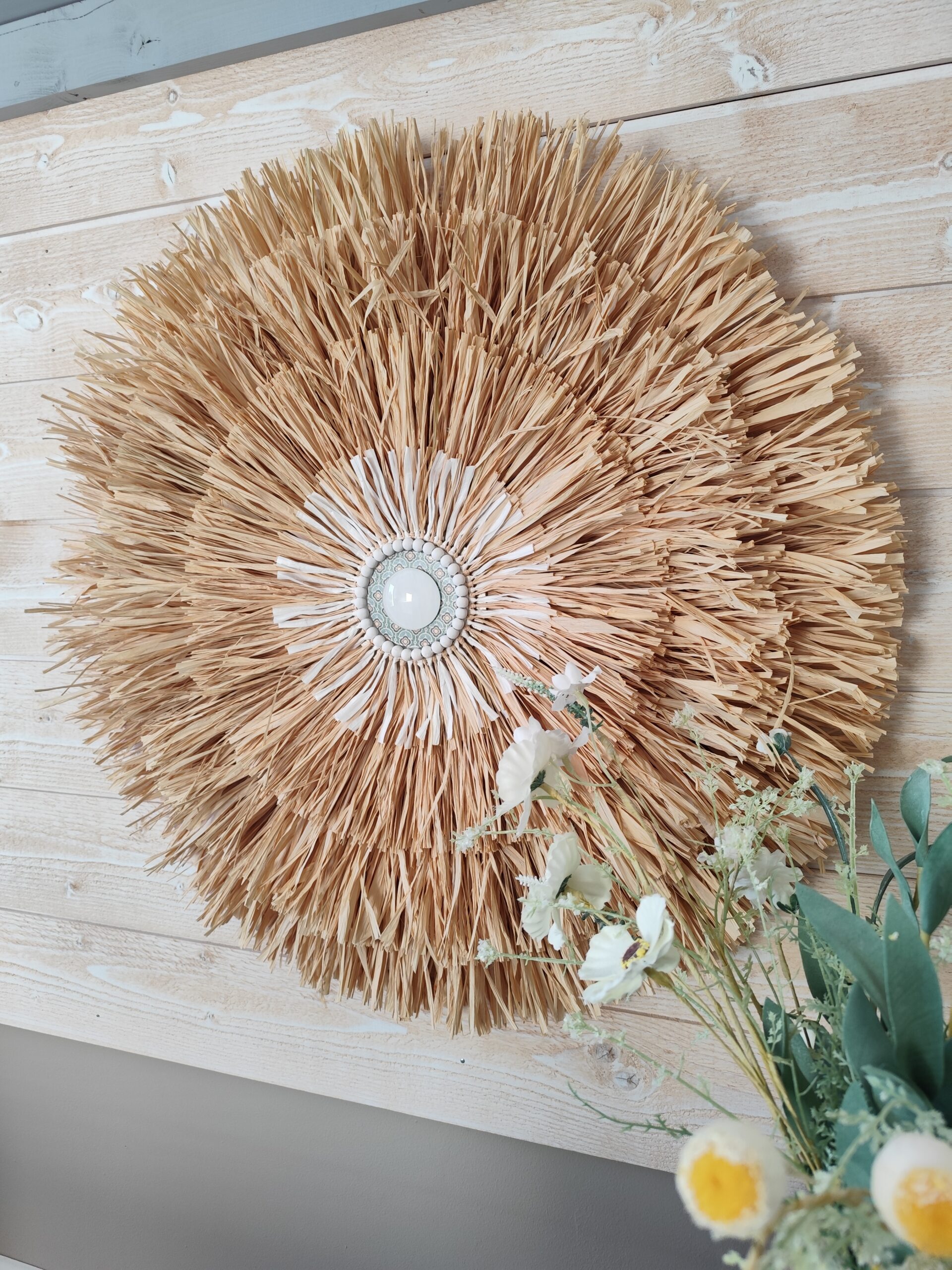 Cette réalisation faite-main combinera le raphia naturel sur 4 niveaux ainsi qu’un élément décoratif tout en relief.Le diamètre fait 70cms.Les articles sont des créations personnelles et donc uniques.Des variations de teintes et de dimensions peuvent survenir.Si vous désirez quelques options personnelles, contactez moi, tout est possible, tout est réalisable.