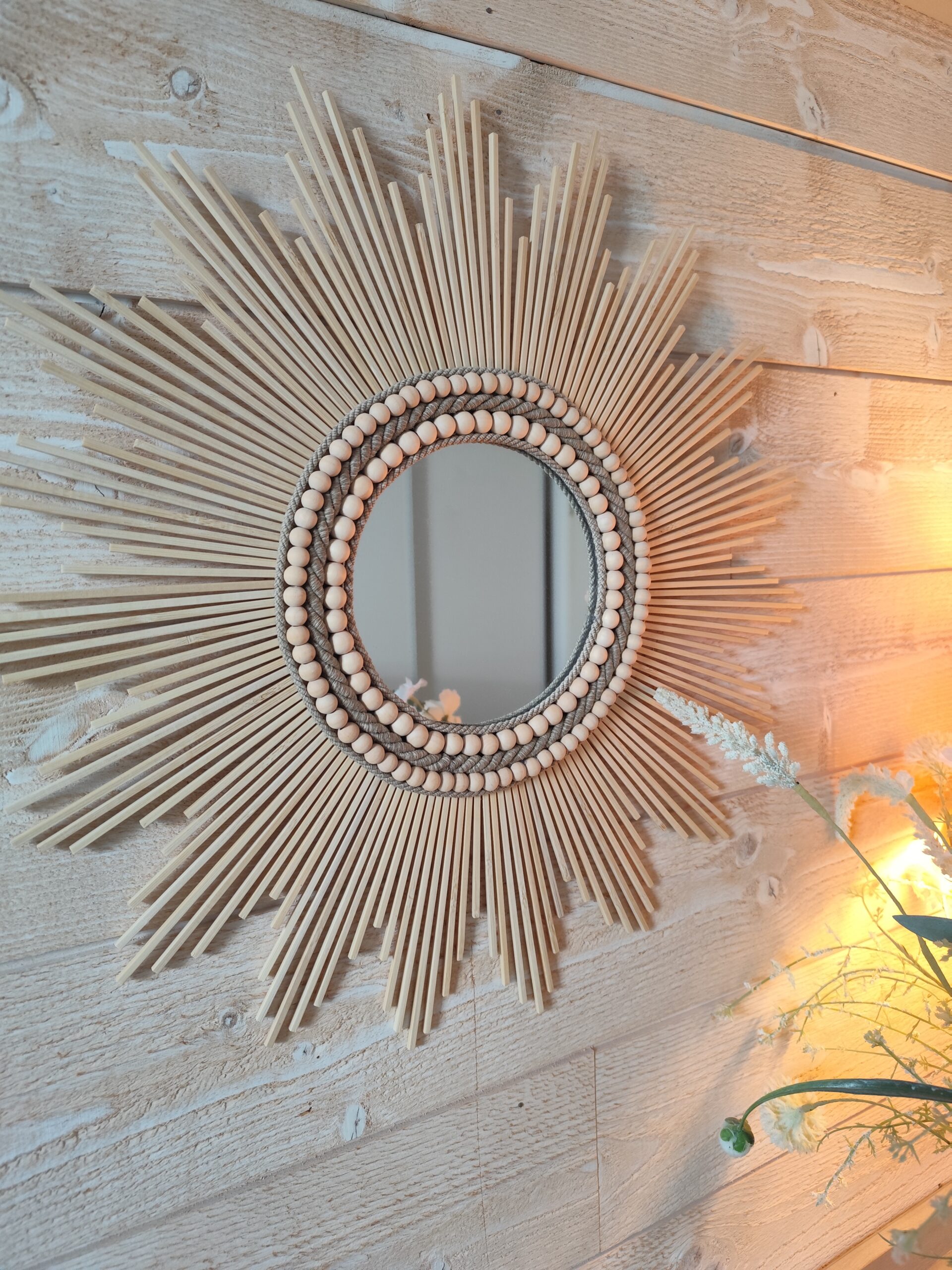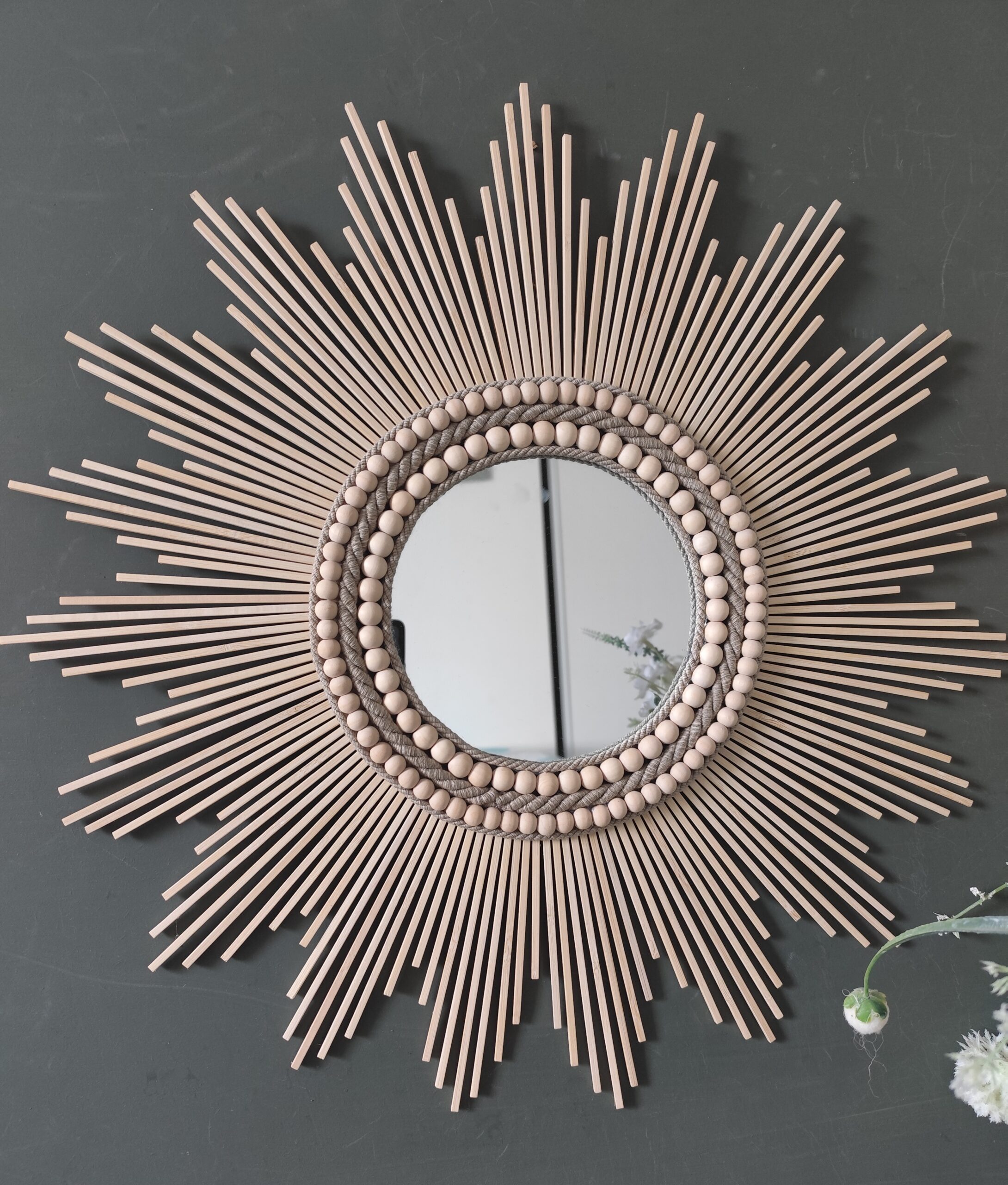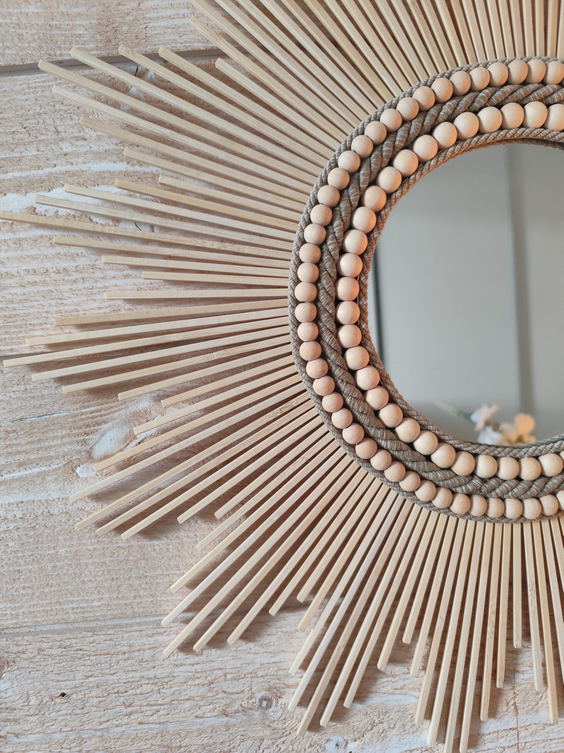 Miroir rond en bois naturel cerné d’un large bord composé de cordes de lin et de deux colliers de perles en bois de cèdre de diamètre différent.