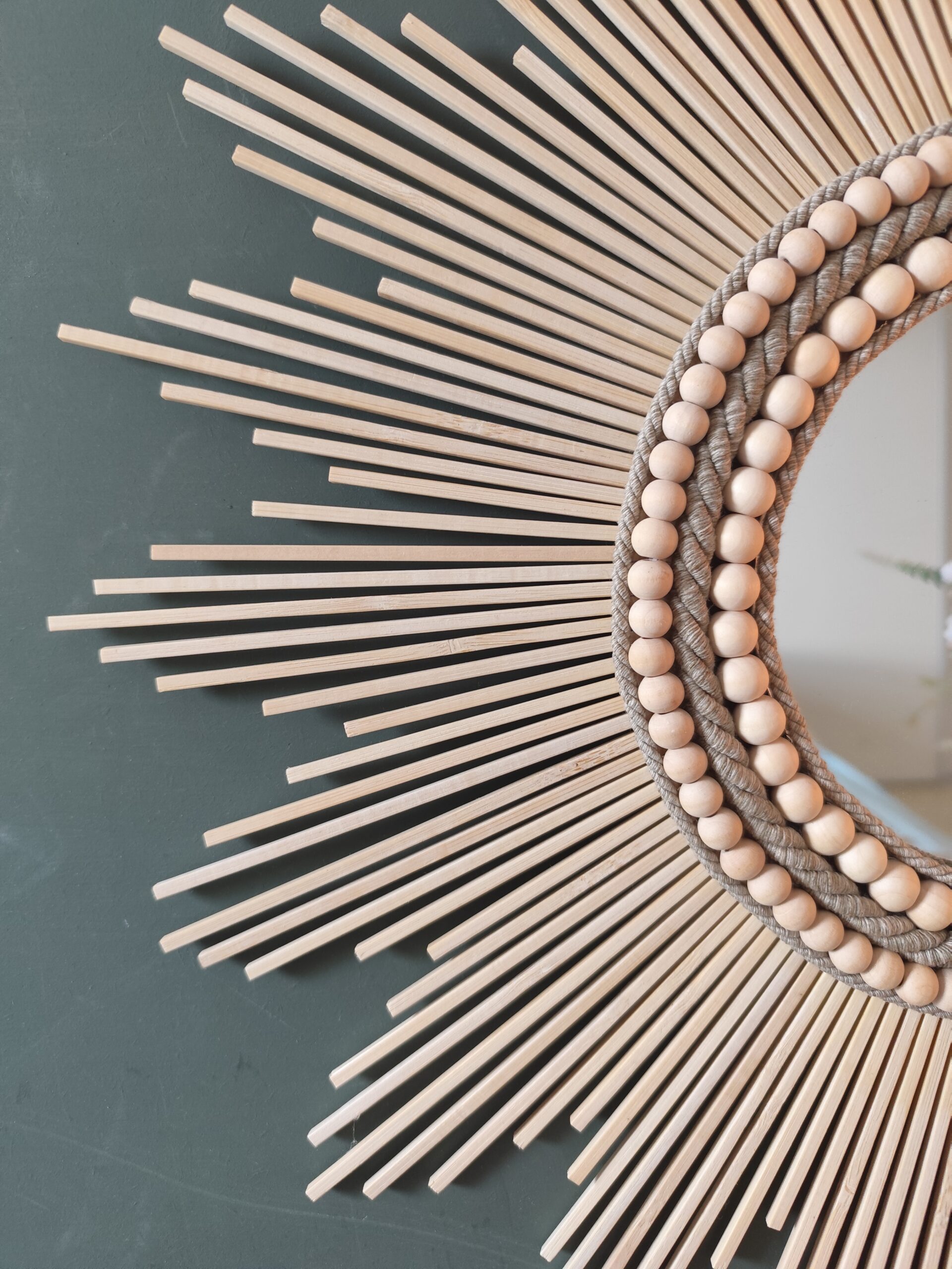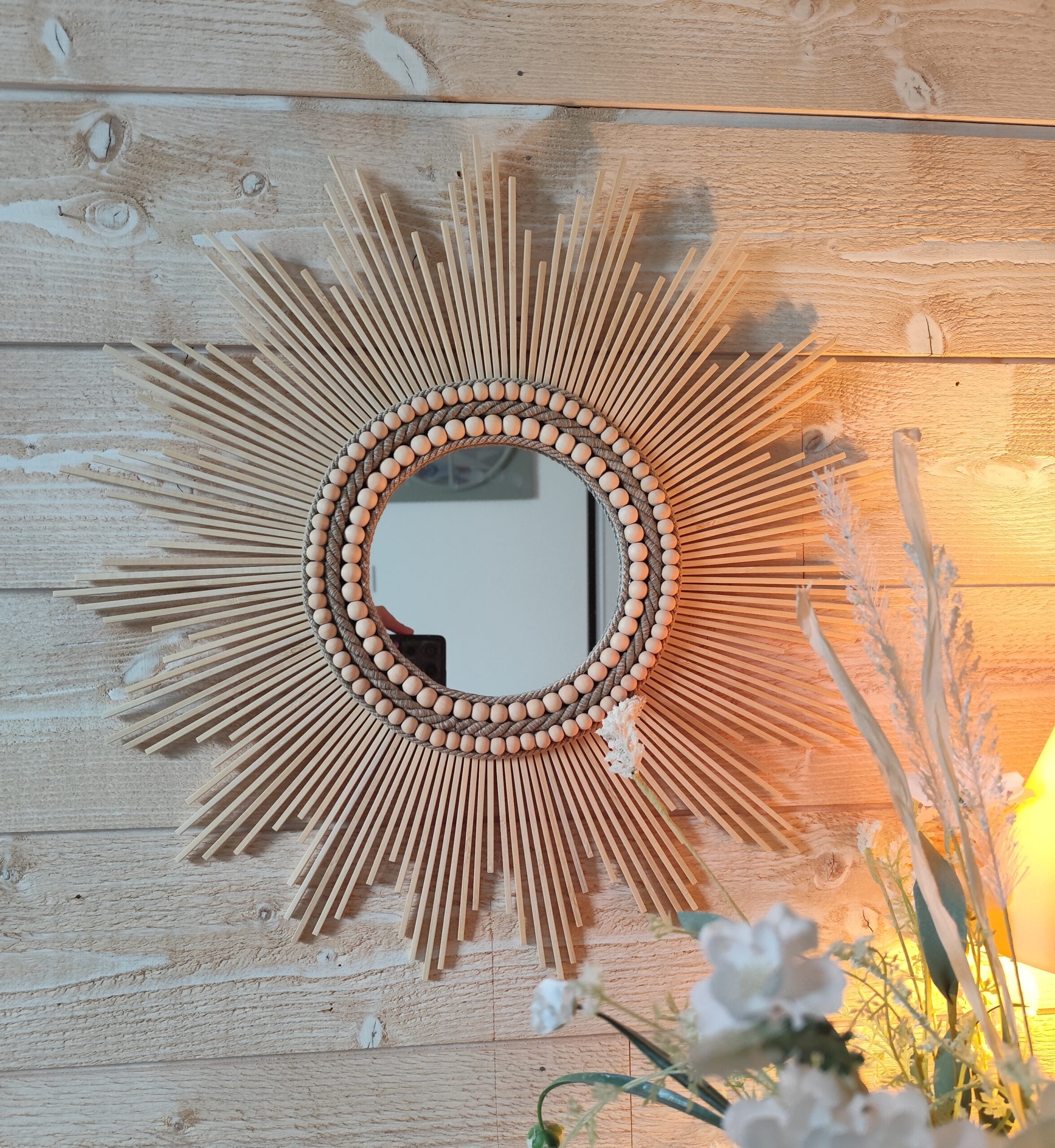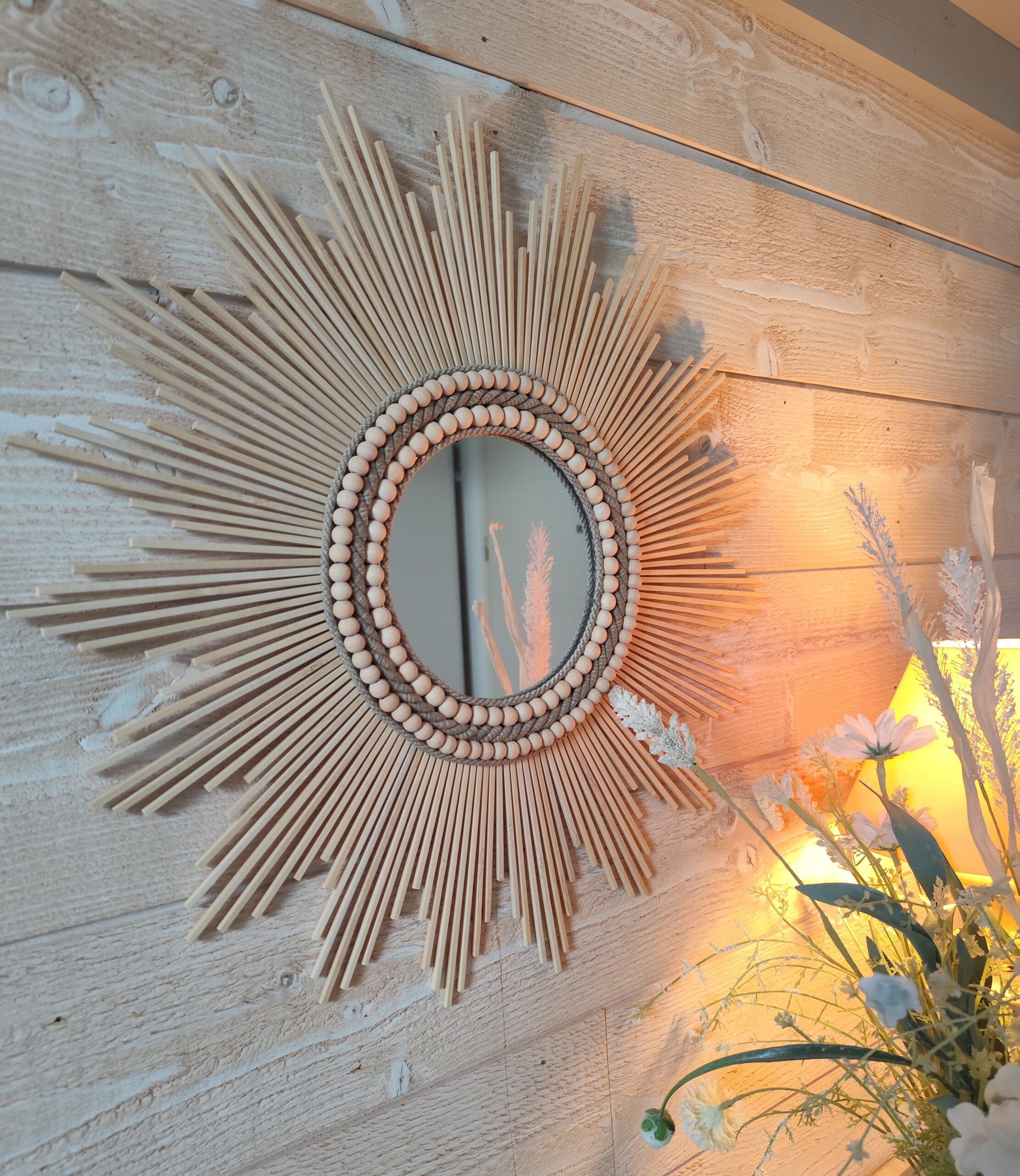Miroir rond en bois naturel cerné d’un large bord composé de cordes de lin et de deux colliers de perles en bois de cèdre de diamètre différent.