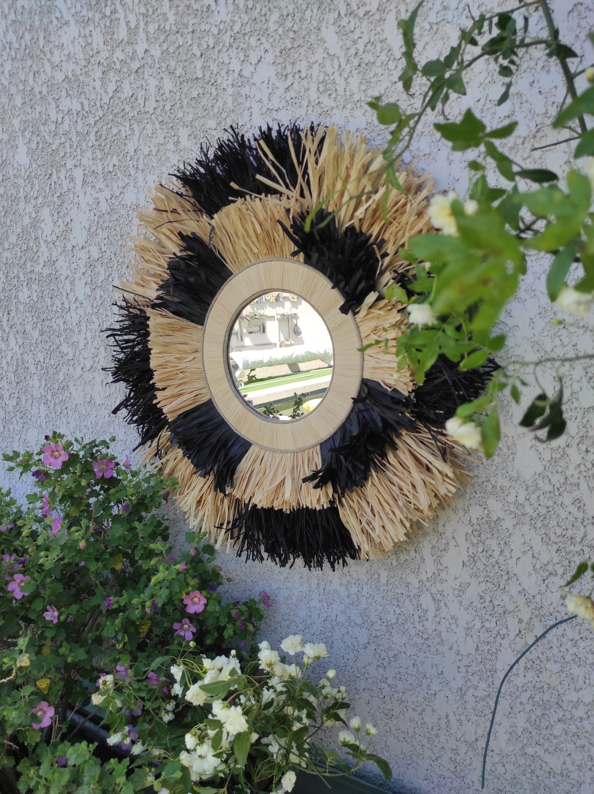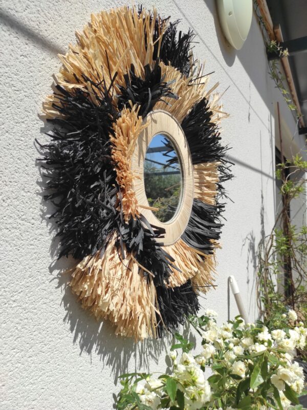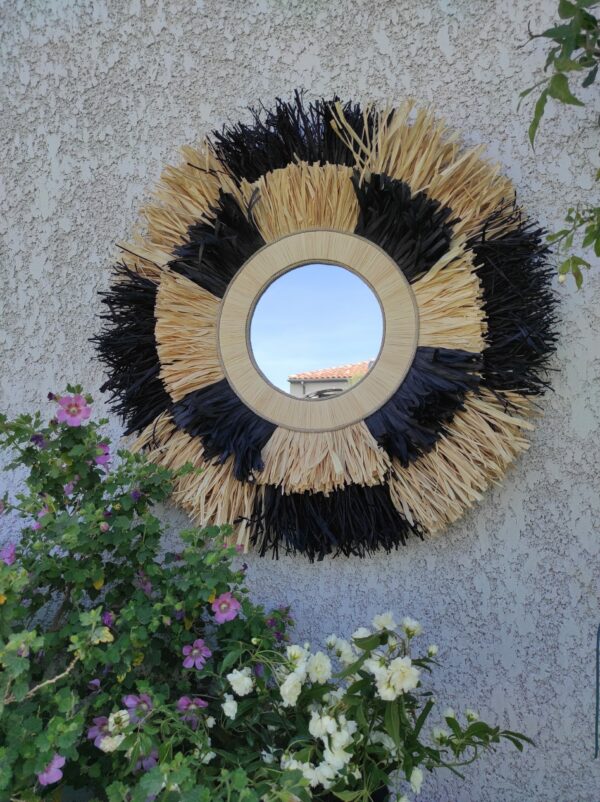 Miroir rond en raphia naturel et noir façon damier meublera à coup sûr votre pièce à vivre.