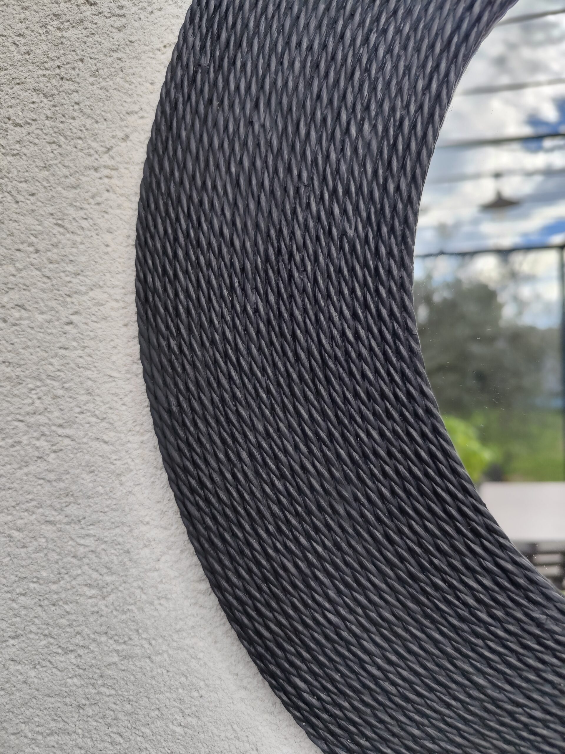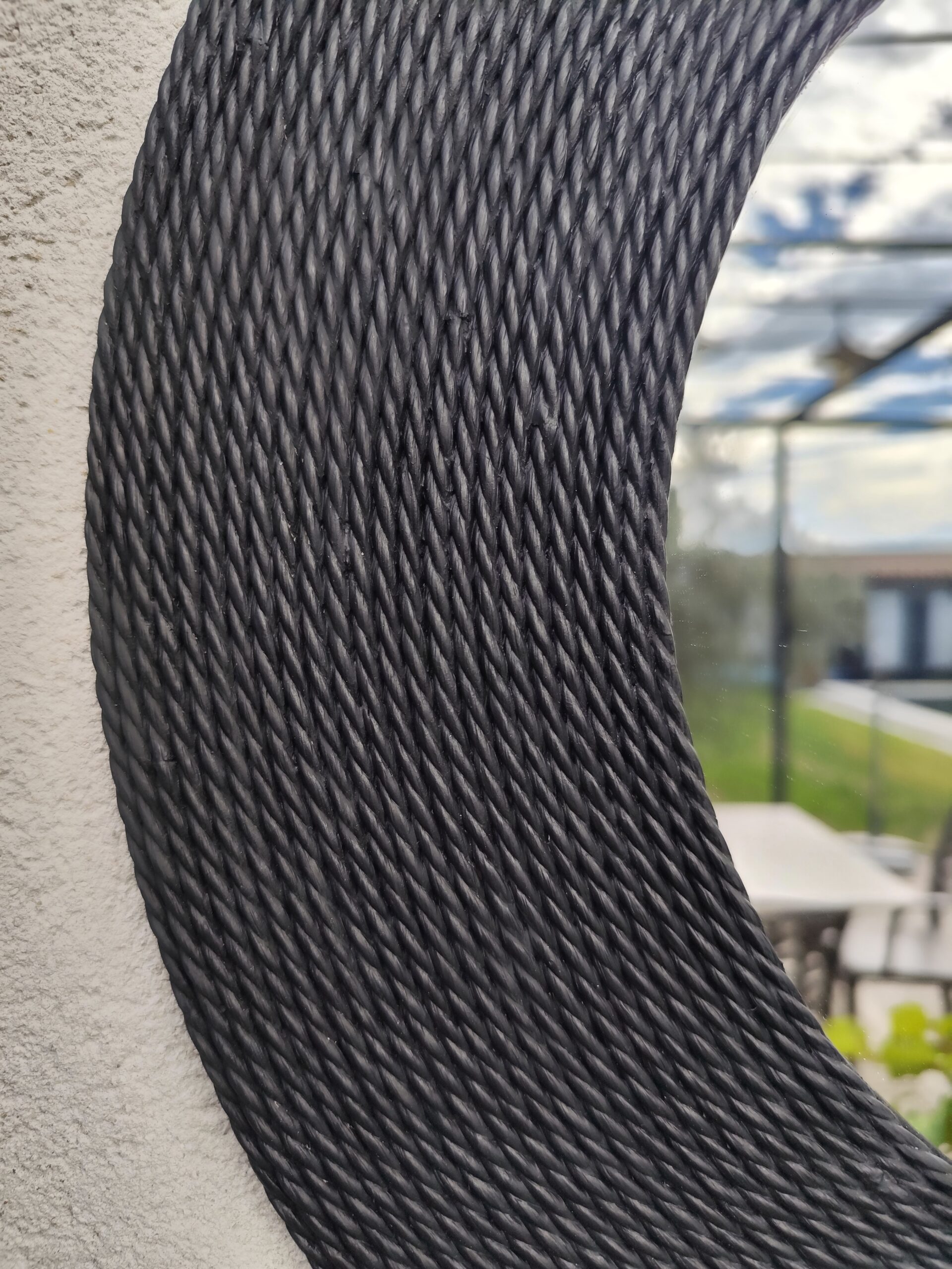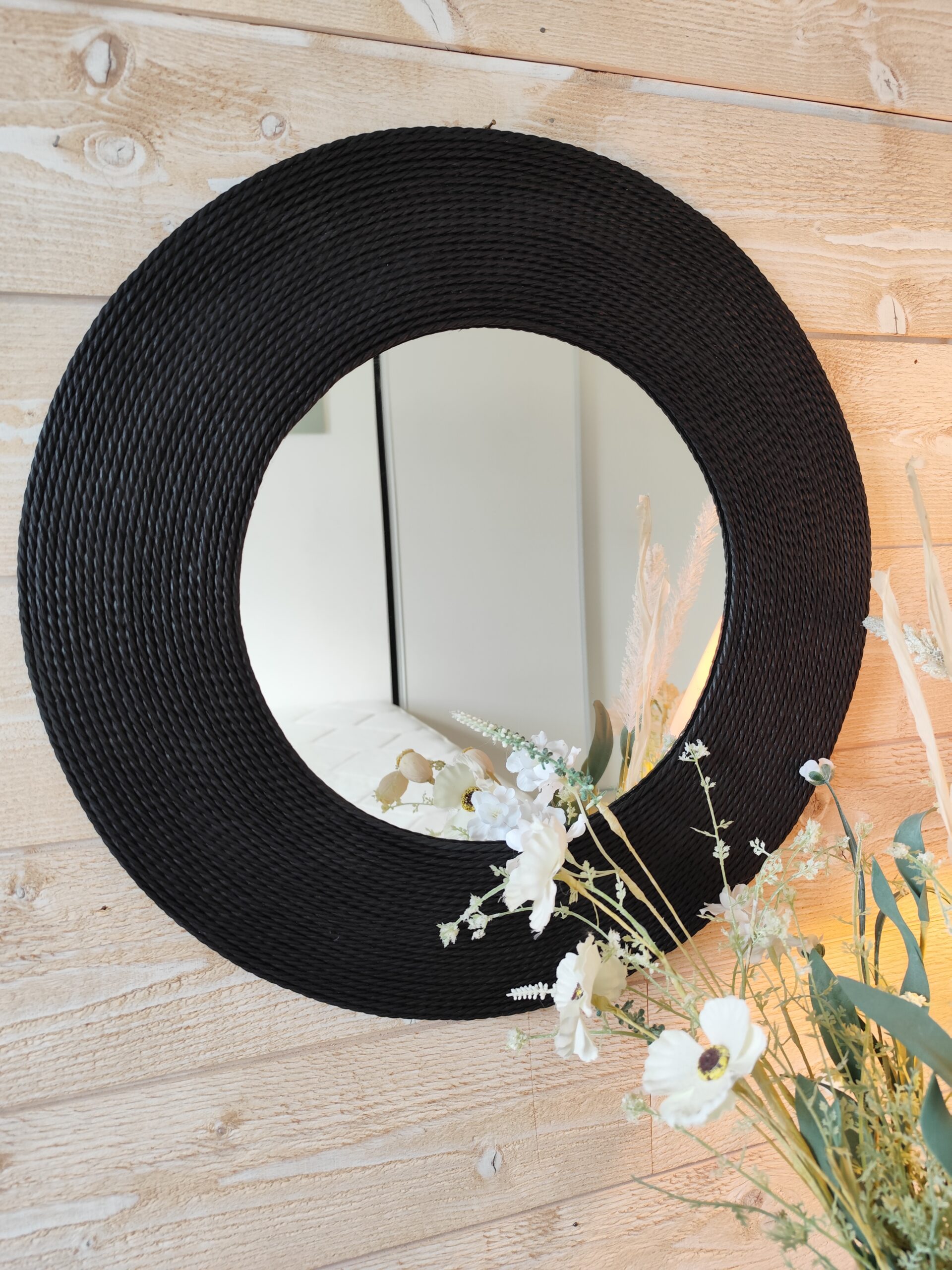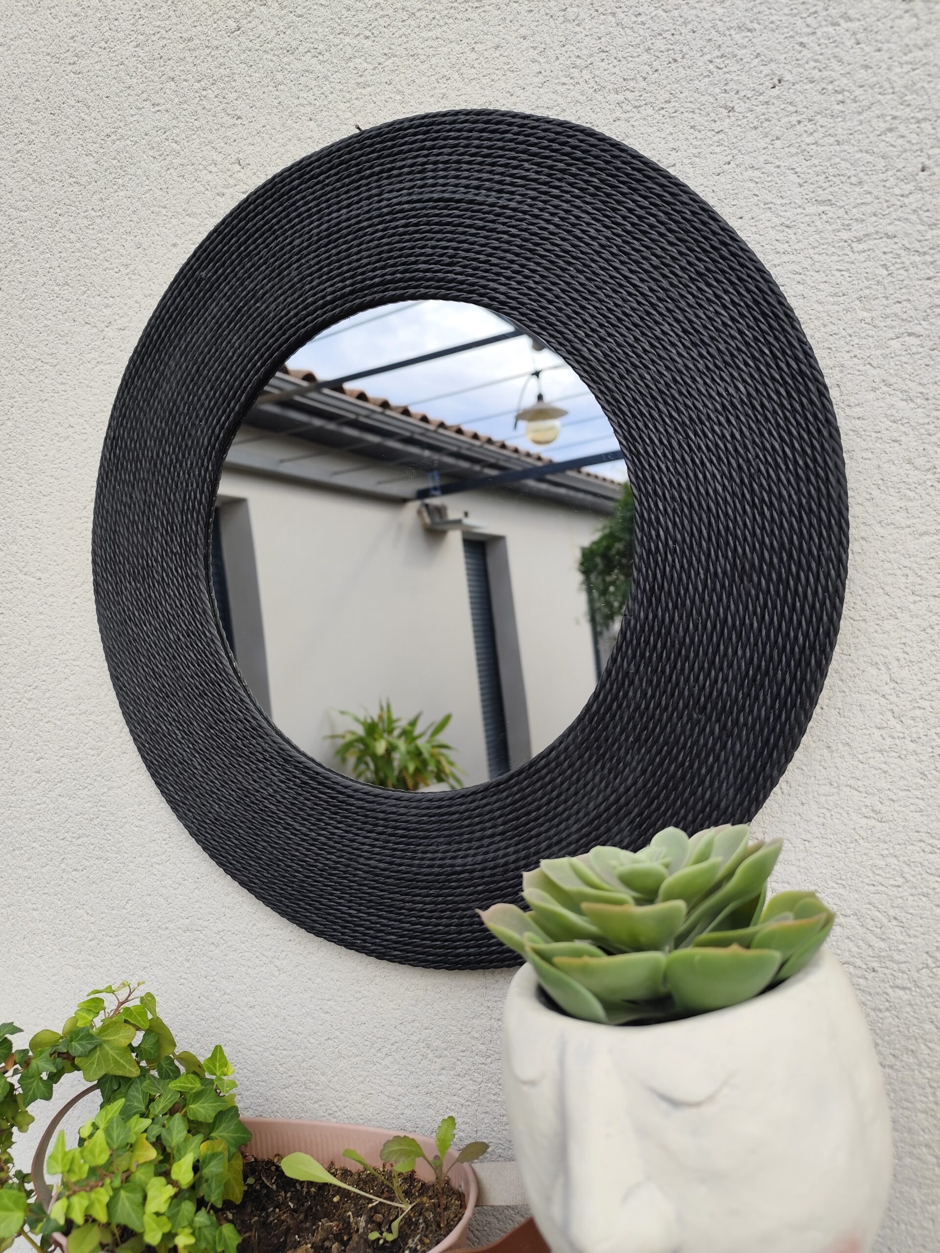 Miroir rond cerné d’un bord en bois recouvert d’un cordage en jonc de mer teinté de noir.